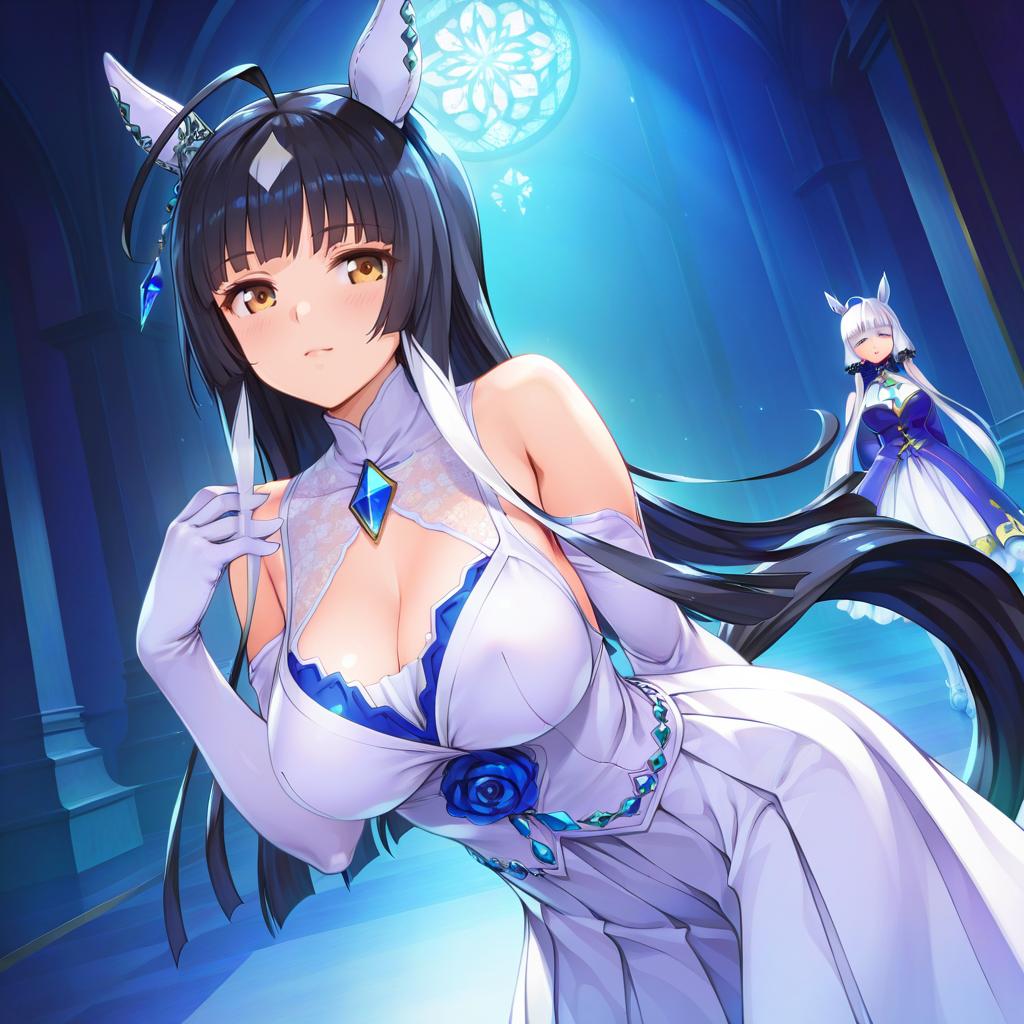Digital illustration of an anime-style horse girl with black hair and yellow eyes, wearing an elegant white dress adorned with blue gemstones and a blue rose. She has horse ears with decorative ear covers and a long flowing black horse tail. The setting is a cathedral-like interior with large stained glass windows. In the background, a second horse girl with white hair and similar attire is visible.