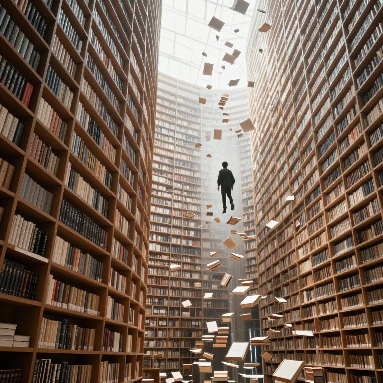 A digital illustration depicts a vast library with towering wooden bookshelves filled with books on both sides. In the center, a silhouette of a person in mid-air is surrounded by floating books and papers, creating a dynamic, almost surreal atmosphere. The background shows a bright, white ceiling, contrasting with the dark wood of the shelves and the varied colors of the books. The floating objects add a sense of motion and chaos amidst the otherwise structured environment. The overall style is modern, with clean lines and a slightly exaggerated perspective.