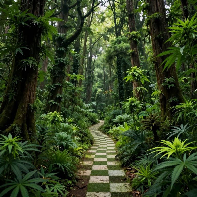 The image depicts a surreal, magical cannabis forest with a game board path weaving through the dense foliage. The forest is filled with tall, leafy trees and various types of plants, creating a lush, verdant environment. The path, which appears to be made of a checkered pattern, leads through the forest, guiding the viewer's eye towards the center of the image. The colors are predominantly green, with shades ranging from deep forest greens to lighter, more vibrant greens, creating a sense of depth and dimension. The textures of the foliage are varied, with some leaves appearing smooth and others more rugged, adding to the realism of the scene. The overall composition is balanced, with the path serving as a central axis that draws the viewer's attention through the forest. The interplay of light and shadow within the forest adds to the mystical and enchanting atmosphere of the image.