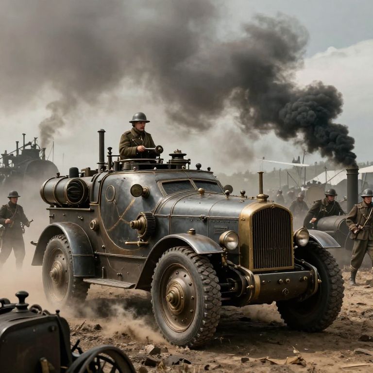 Photograph-style digital art of a black vintage armored car with large tires, emitting smoke, driven by a soldier in a hat, amidst a war-t