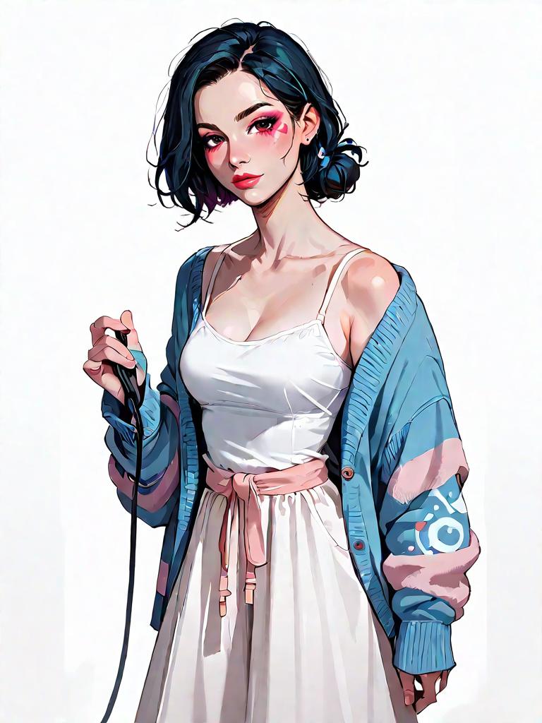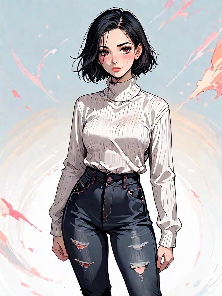 1girl, source_comics, realistic face, full body shot, Woman, contemporary chic, cropped bell-sleeved top in deep magenta, high-waisted black ankle-length trousers, chunky platform sandals in black with brown block heel, holding textured clutch, solid white background.