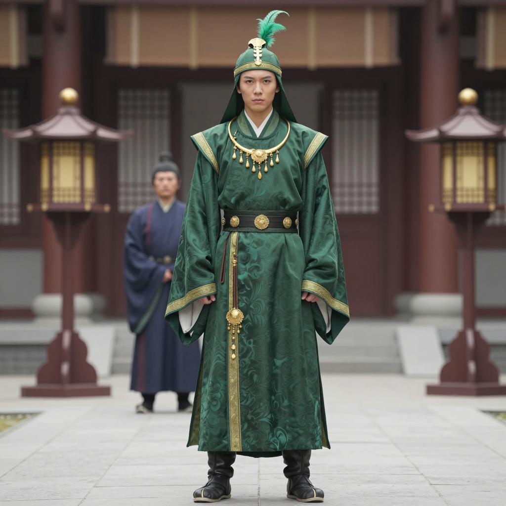 Green ember costume, photorealistic portrait, ancient Chinese warrior, standing in front of traditional building, wearing green silk robe with gold trim, matching headpiece with green feather, leather sandals, gold necklace, serious expression, daylight, two lanterns on columns, blurred background with another person in dark blue robe, stone floor, detailed ures, natural light, medium shot, historical costume, traditional architecture, realistic lighting, focused subject, background slightly out of focus, realistic color palette, traditional Chinese clothing, ceremonial attire