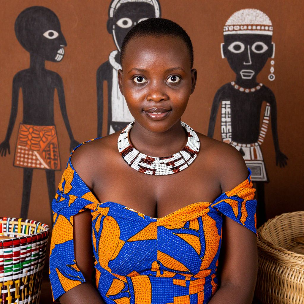 Photograph of a dark-skinned African woman with short hair, wearing an off-the-shoulder blue and orange patterned dress and a white beaded necklace. She is seated against a brown wall adorned with black and white painted figures in traditional African attire. A colorful woven basket is partially visible on the left. The woman's expression is neutral, and the background figures are stylized with large heads and minimalistic details. The image has a vibrant and cultural aesthetic, highlighting traditional patterns and attire.