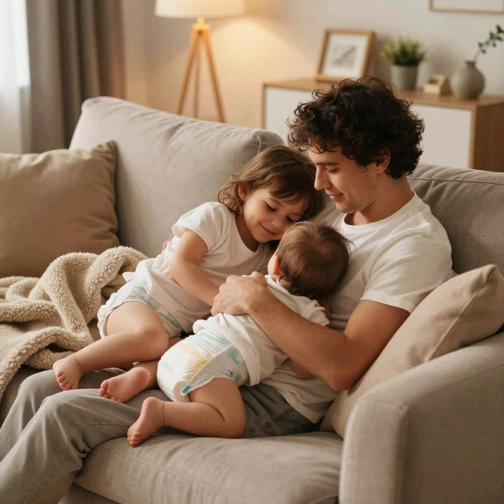 Diaper couples sharing a quiet moment on a comfy couch in a warmly decorated living room, soft blankets and cushions around, with a focus on tenderness, intimacy, and a cozy, inviting environment.