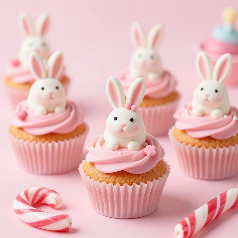 Pastel pink cupcakes adorned with whimsical white bunnies and candy canes create a dreamlike tableau where reality bends into a playful, fantastical world.