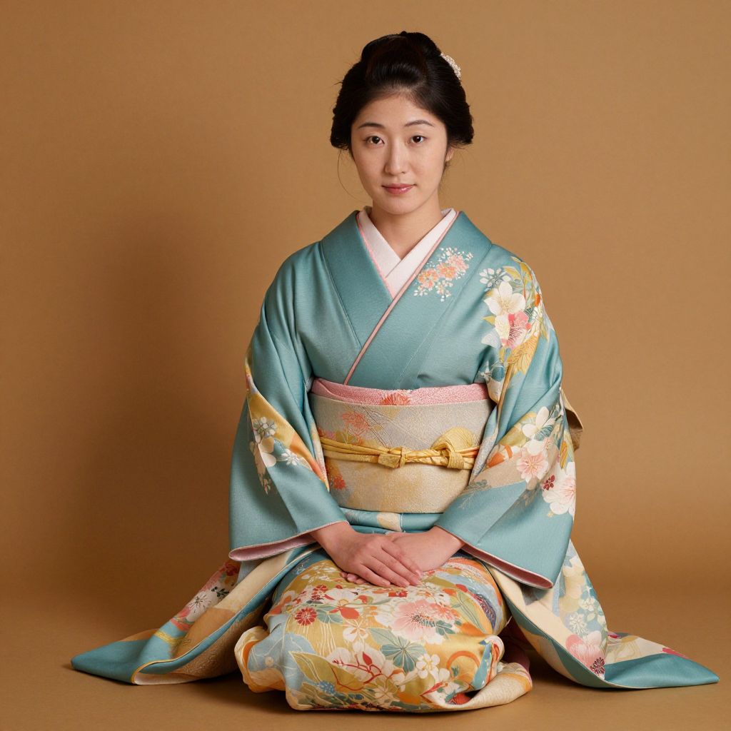 Seated gracefully in traditional Japanese attire, a woman adorned in a flowing kimono featuring delicate floral patterns and teal accents rests her hands gently on her lap, exuding elegance against a warm, earth-toned backdrop.