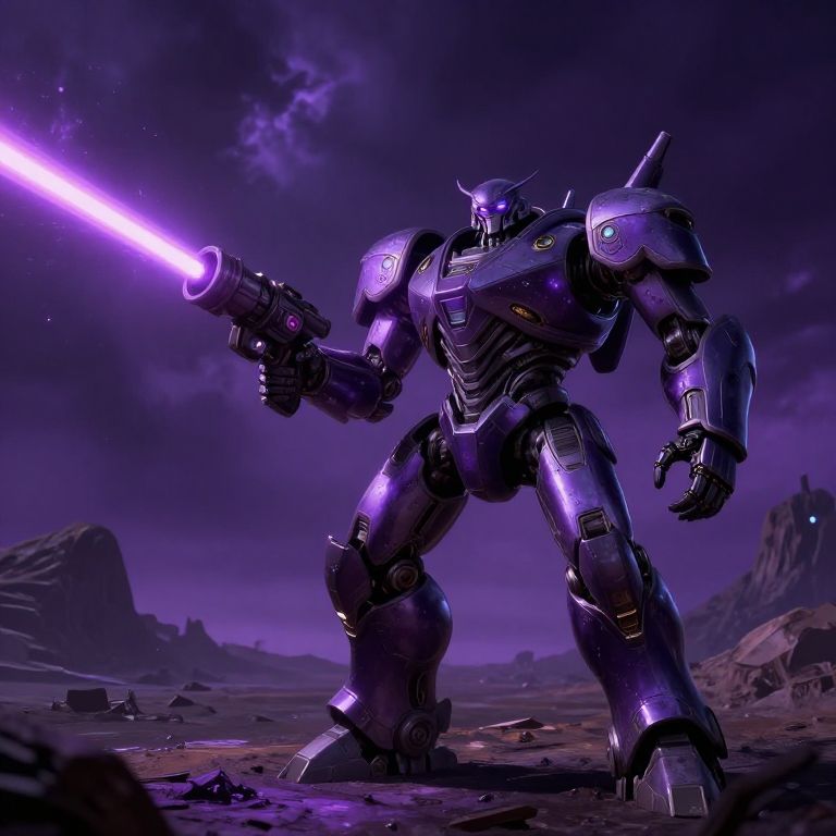 Zurg, a powerful robotic overlord, wielding a massive laser cannon, standing on a barren alien planet under a stormy sky, dark purple and metallic textures, cinematic composition with intense shadows, high resolution sci-fi illustration.