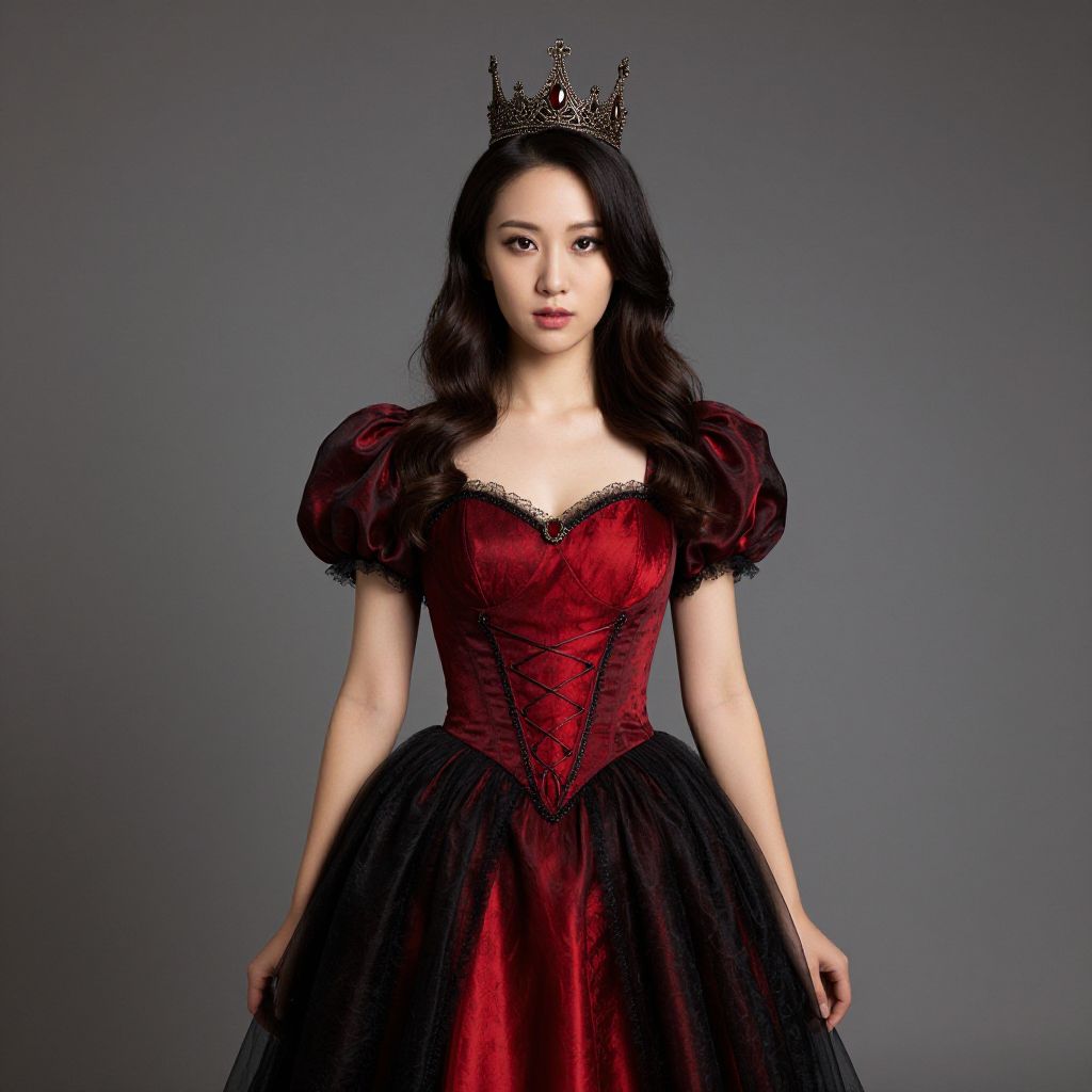 Photograph of an Asian woman with long, wavy black hair wearing a black, jeweled crown. She is dressed in a red velvet corset with black lace trim and puffed, short sleeves, paired with a voluminous black tulle skirt. Her expression is neutral, and she stands against a plain gray background. The corset is tightly laced, accentuating her slender, petite frame. The lighting is soft, highlighting the rich textures of her dress and the subtle sheen of the velvet. The overall style is reminiscent of a fairy tale princess, with a focus on elegance and regality.