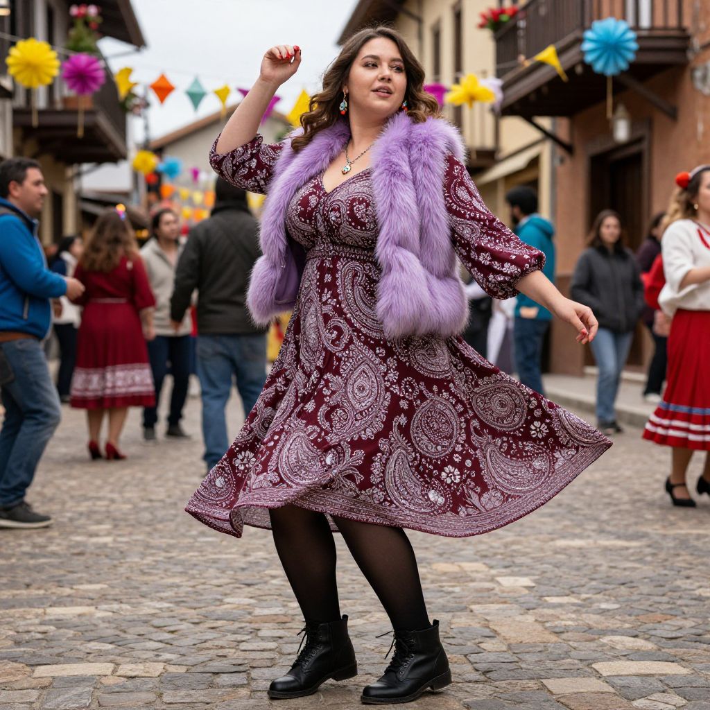 A Plus-size woman in a boho chic burgundy and white paisley print dress with three-quarter sleeves and a flared skirt, layered with a light purple faux fur vest, is enjoying a cultural celebration in a charming old town. She wears sheer black tights and black lace-up ankle boots, with natural makeup and loose wavy hair. The scene captures her joy as she dances among colorful decorations, embodying the vibrant atmosphere. Visual style: Pedro Campos. Sexy. Pretty face and beаutiful eyes. Big breasts