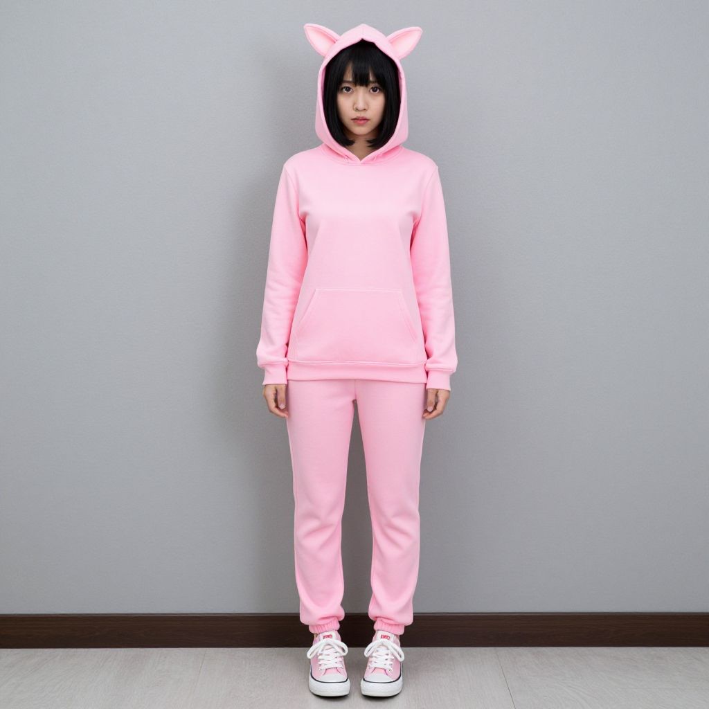 Photograph of a young person with black hair, wearing a pink cat-ear hoodie, matching pink pants, and white sneakers, standing against a plain