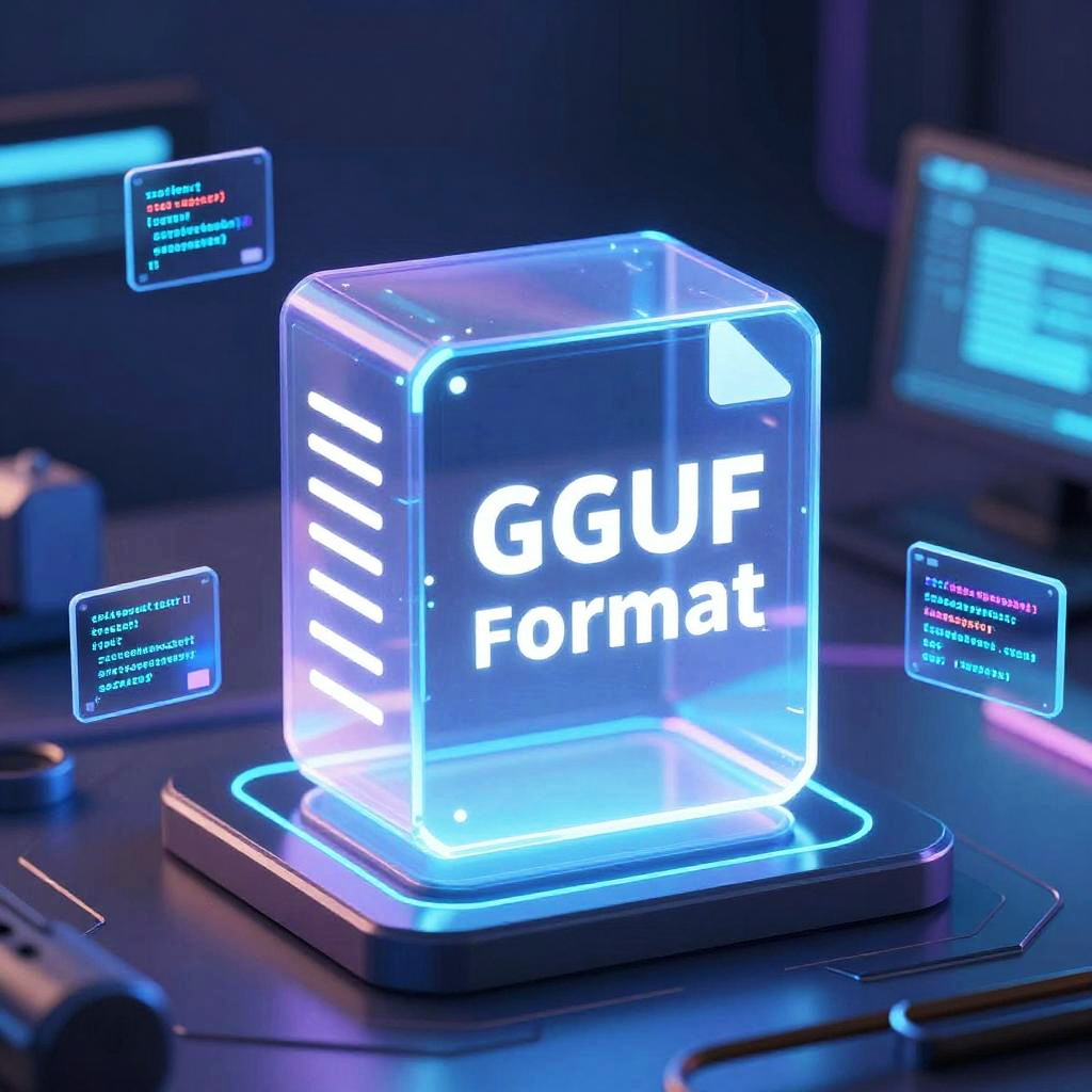 Close-up of gguf format file represented as a glowing holographic cube, surrounded by floating data packets and code snippets, sleek futuristic computer lab background, vibrant blues and purples, digital art with sci-fi aesthetics