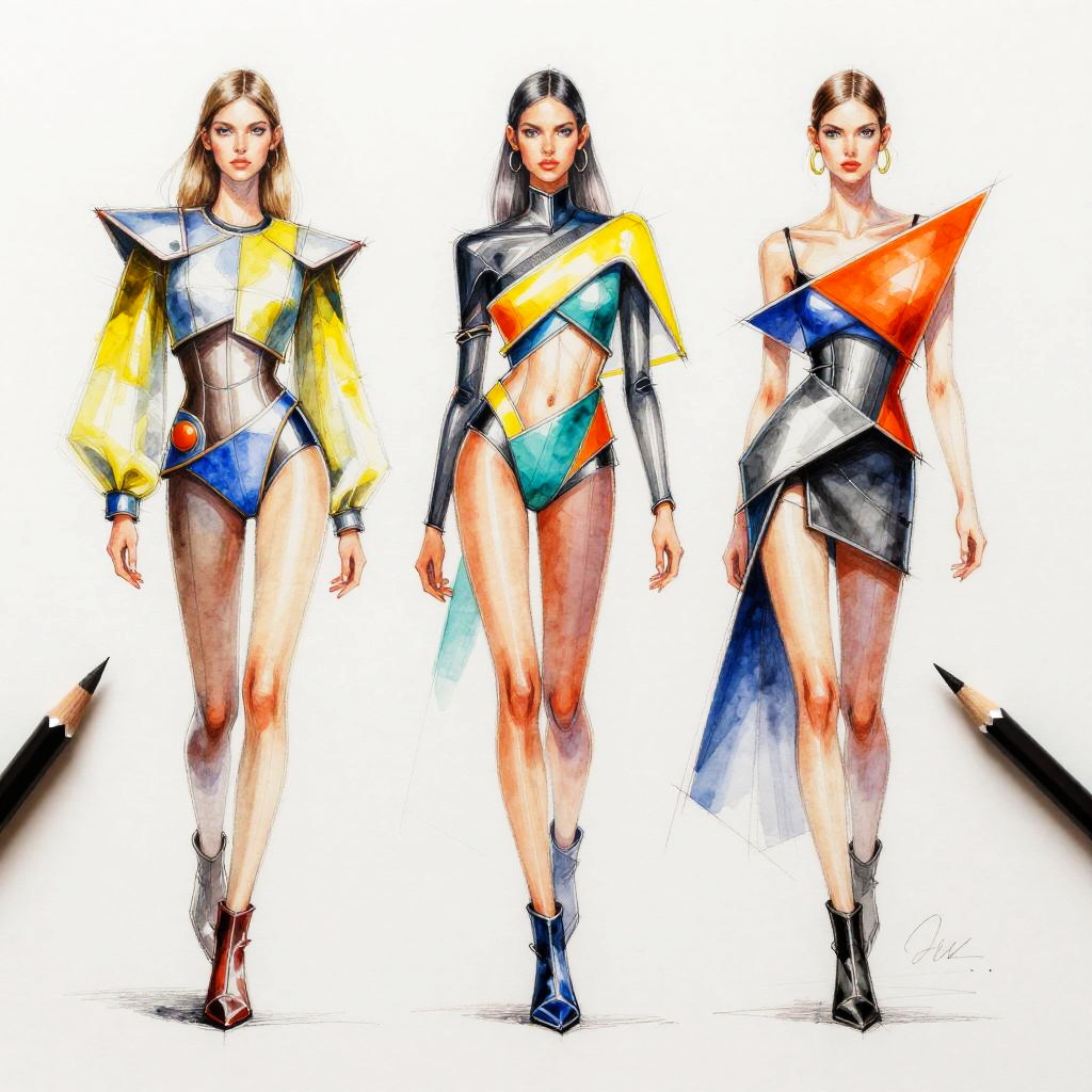 Sketch fashion designer illustrating futuristic fashion concepts with bold shapes and bright colors, mixed media techniques blending pencil, ink, and watercolor, vibrant artwork showcasing innovation and creativity in a contemporary artistic setting.