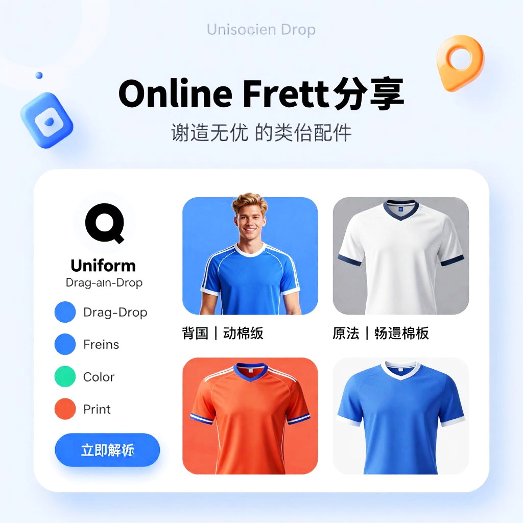 Design a uniform online free platform concept featuring intuitive layout, drag-and-drop features for logo and color adjustments, diverse uniform templates, seamless integration with print options, bright and engaging visuals, futuristic style, user-centric design approach.