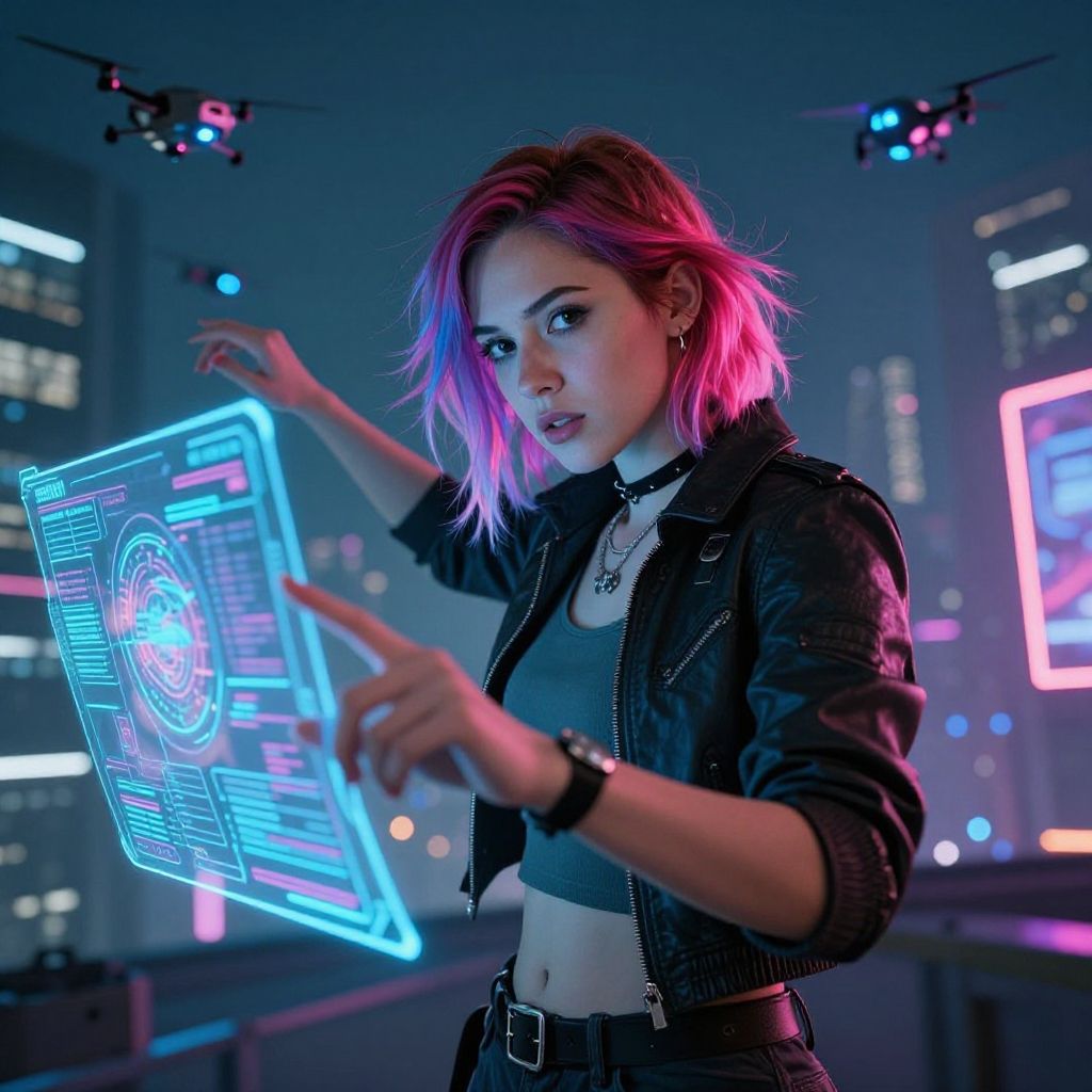 (stunning intimate moody cinematic establishing shot, young adult woman looking at viewer, highly detailed background:1.1), volumetric lighting, subsurface scattering, dynamic pose, (special effects, color grading, fantasy aura:1.4), In a cyberpunk cityscape, a woman with neon hair hacks into the digital ether, her fingers dancing over holographic interfaces, with drones buzzing around.