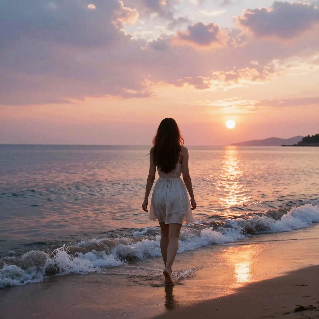 Man on knees praying at the edge of a calm ocean during sunset, waves gently lapping the shore, warm golden hues, silhouette effect, deep spiritual connection with nature
