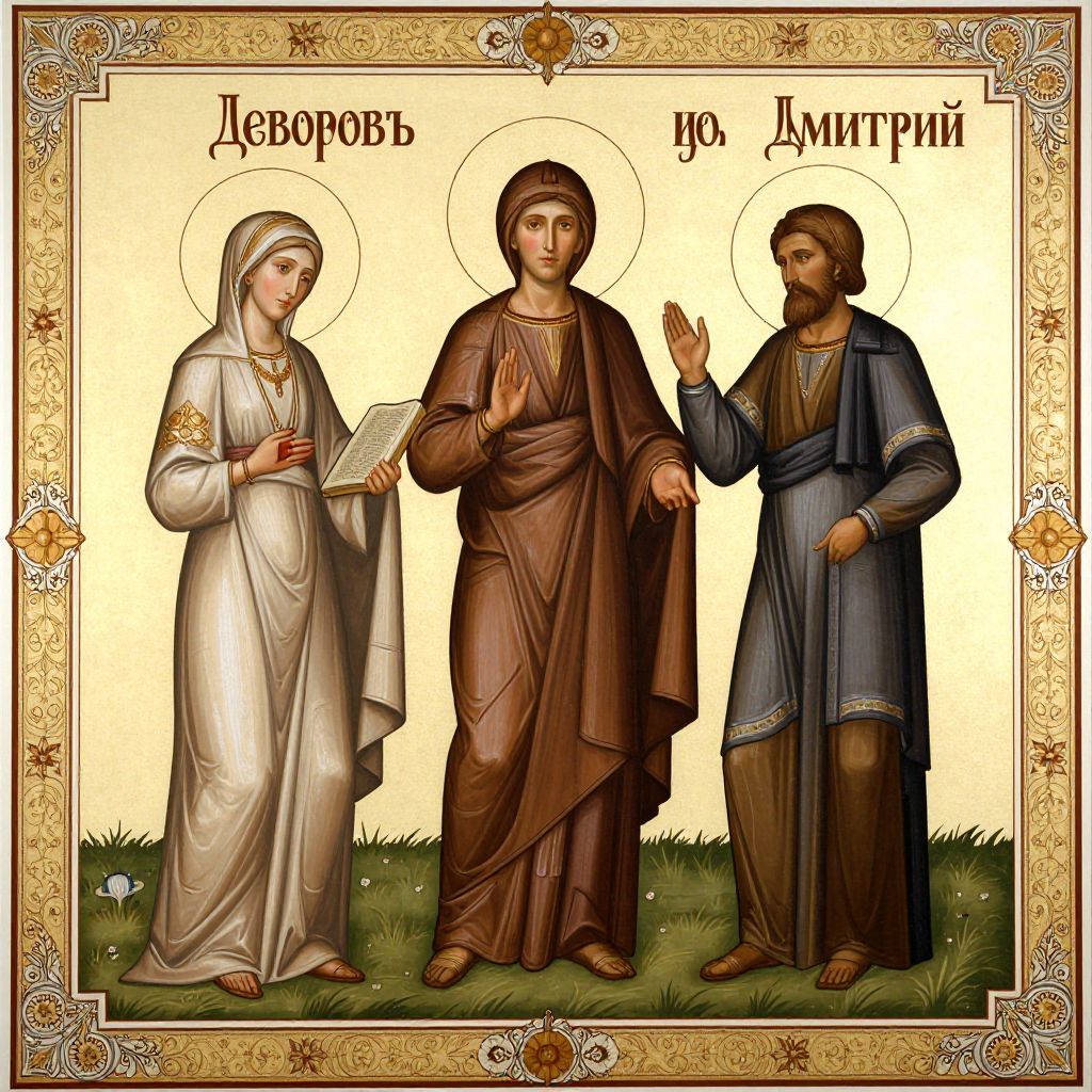 Russian icon depicting the Meeting of the Lord, featuring three figures—two women and one man—each adorned with halos, standing on grassy ground, with one woman holding a book and another gesturing upward, surrounded by ornate borders and Cyrillic text identifying them as \"Деворовъ\" and \"Дмитрий.\