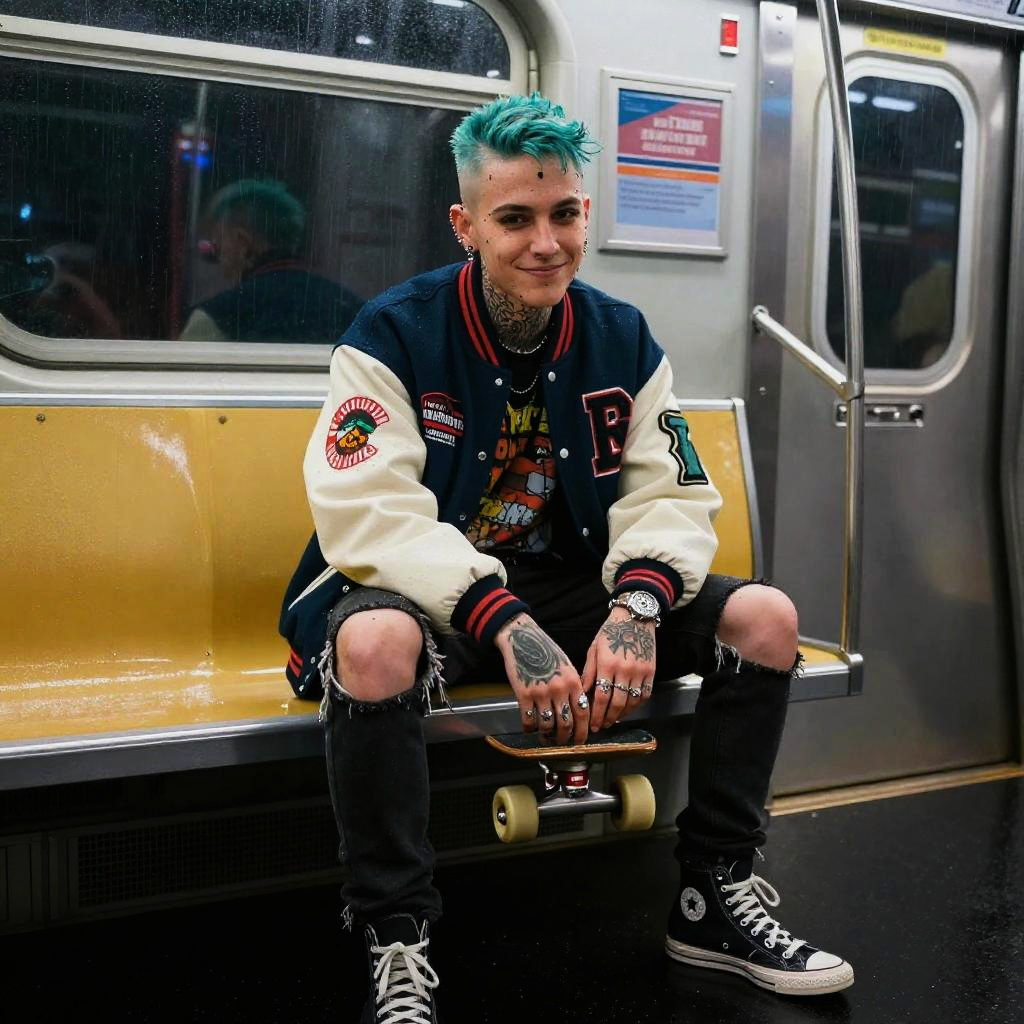 Genderqueer skater with teal undercut, sleeve tattoos and multiple piercings sitting in a rain-splattered subway car at night, wearing an oversized vintage varsity jacket, band tee, ripped black jeans and high-top canvas sneakers, with neon backlight with wet-reflection glow and a wry smirk
