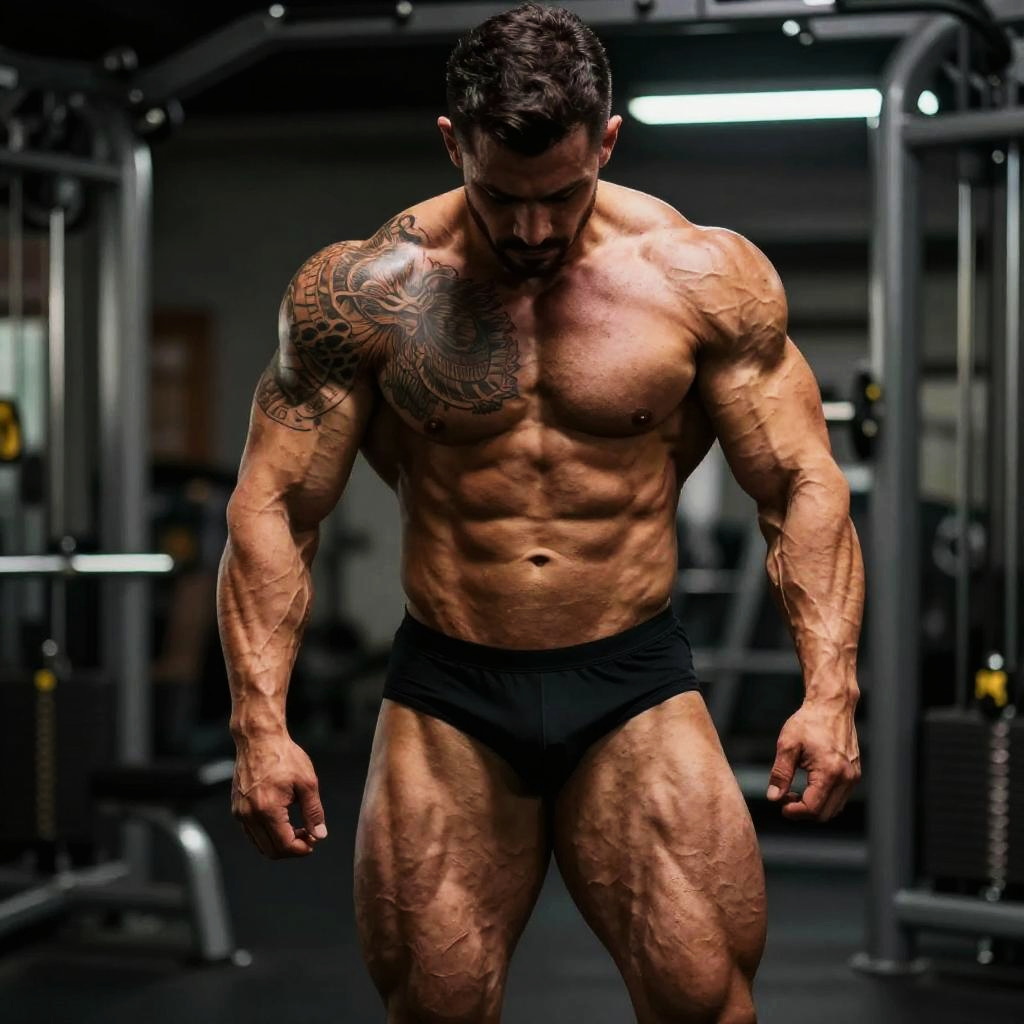 Muscle black man posing in an urban gym with weights, intense focus on his chiseled physique and muscle definition, gritty industrial background, cinematic lighting with strong contrasts, hyper-realistic digital painting style.