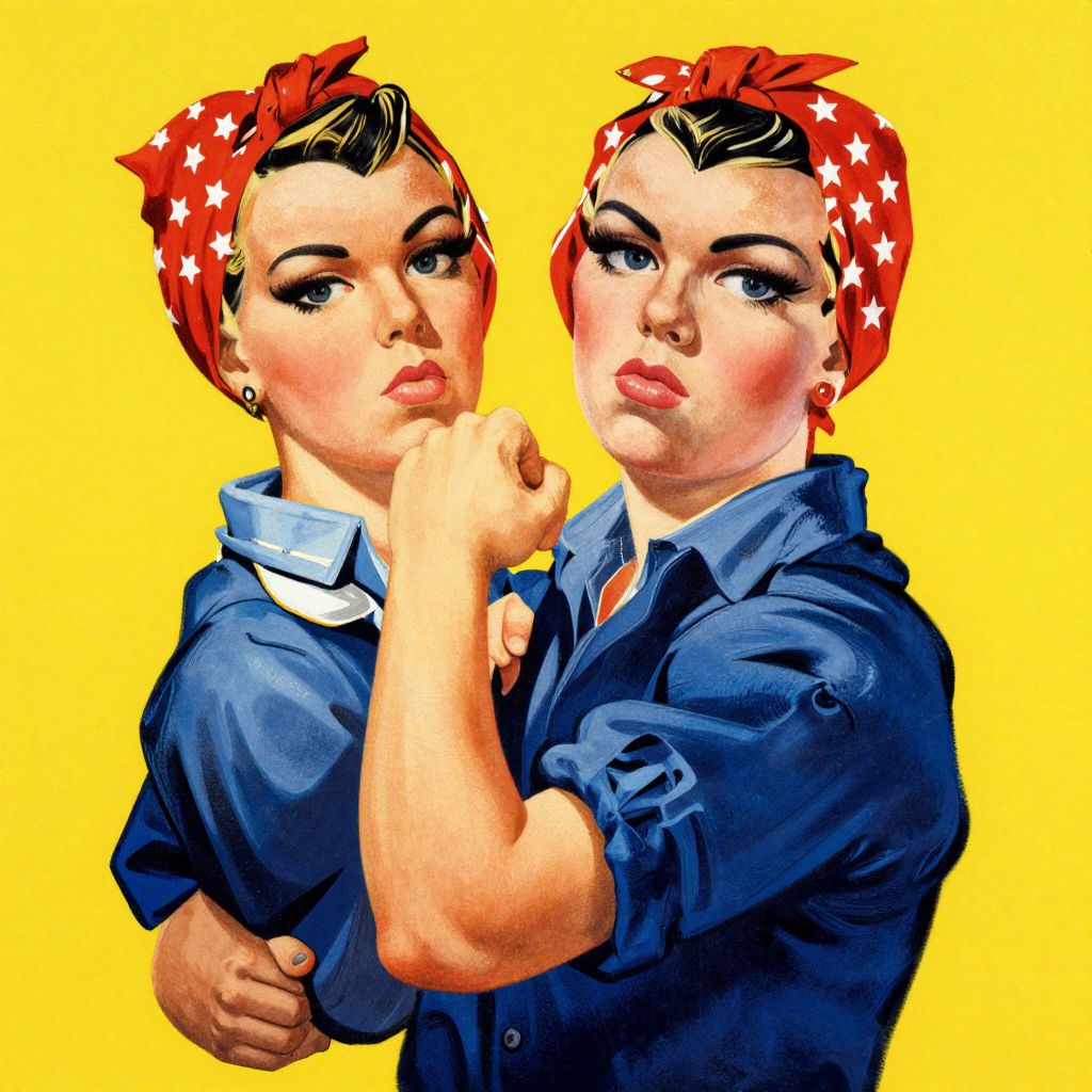 A vibrant retro-style illustration featuring Norman Rockwell's iconic \"Rosie the Riveter,\" showcasing a confident woman in a blue work uniform and red headscarf with white stars, flexing her muscular arm against a bold yellow background, embodying strength and empowerment in a classic mid-20th-century American propaganda aesthetic.