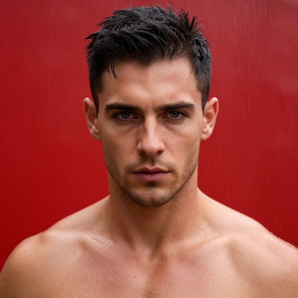 1boy, red background, absurdres, masterpiece, highres, intricately detailed, a gay man, sexy, muscular, strutting outdoors, gorgeous eyes, detailed face, pouring rain, outdoors, global illumination, subsurface scattering