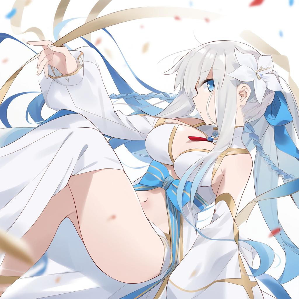 Morgan le fay (water princess) (fate), fate/grand order, 1girl, blue eyes, very long hair, white hair, grey hair, blue hair, ponytail, sidelocks, twin braids, french braid, hair flower, hair ribbon, large breasts, cleavage, thighs, navel, white bikini, bare shoulders, detached sleeves, puffy long sleeves, gold trim, by artist mousou (mousou temporary), leet