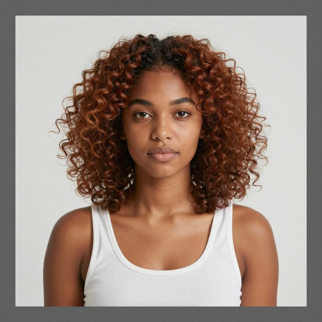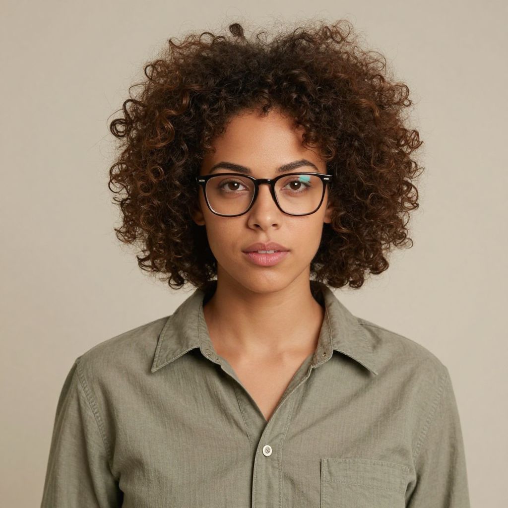 Photograph of a young woman with medium brown skin and curly, voluminous dark brown hair. She wears black, rectangular glasses with a thin frame and a light green, button-up shirt with a collar and chest pocket. Her expression is neutral, with slightly parted, pink lips. The background is a plain, light beige color, emphasizing her face and upper body. The image is well-lit, highlighting her natural features and the texture of her curly hair. The overall style is modern and minimalistic.
