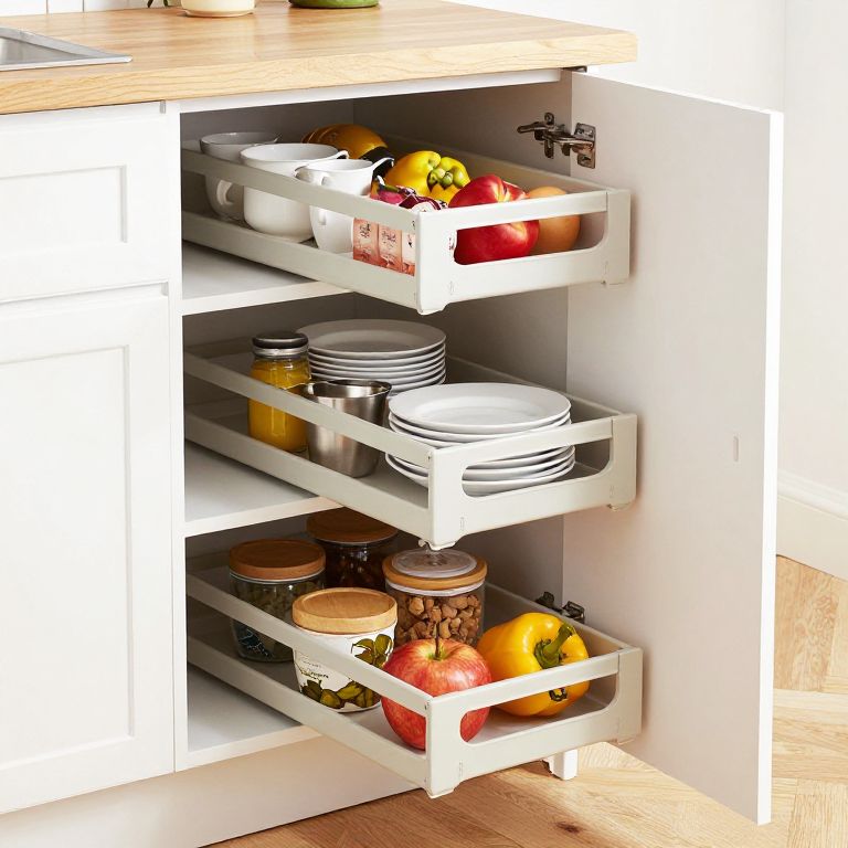 Photograph of a white kitchen drawer with three pull-out shelves, holding white dishes, jars, and colorful fruits like tomatoes and bell peppers.