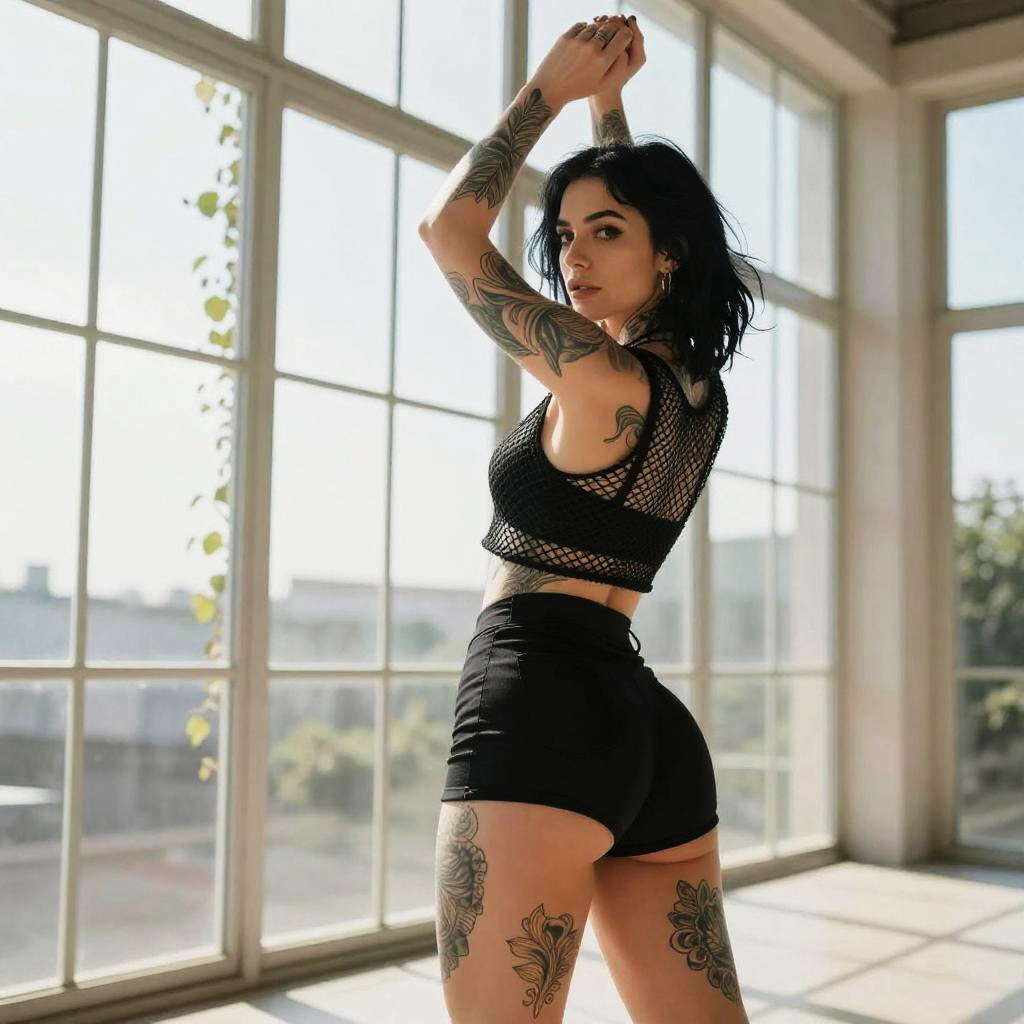 Photograph of a tattooed woman with dark, wavy hair, standing in a sunlit room with large, grid-patterned windows. She wears a black, mesh crop top and high-waisted, black shorts that accentuate her curvy, tattooed hips and thighs. She's looking over her shoulder with a confident expression, arms raised above her head. Her visible tattoos include intricate designs on her arms, thighs, and back. The room has a modern, industrial feel with natural light streaming through the windows, highlighting her toned physique. The background shows a slightly blurred outdoor view.
