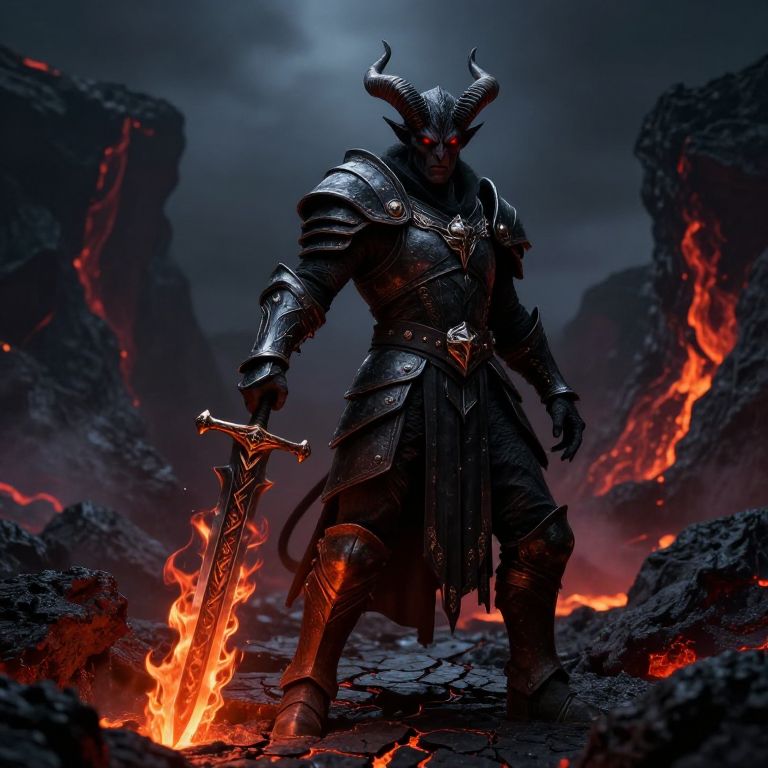 Black tiefling warrior in ornate dark armor standing in a volcanic landscape, cracked molten rocks underfoot, powerful stance with a greatsword engulfed in dark flames, glowing red eyes, demonic horns, epic fantasy style, detailed and vivid.