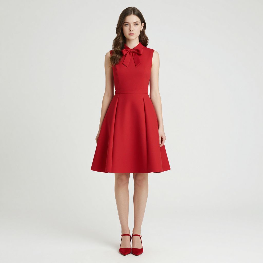 Red Tinkerbell Dress, woman in red dress with red bow and red shoes