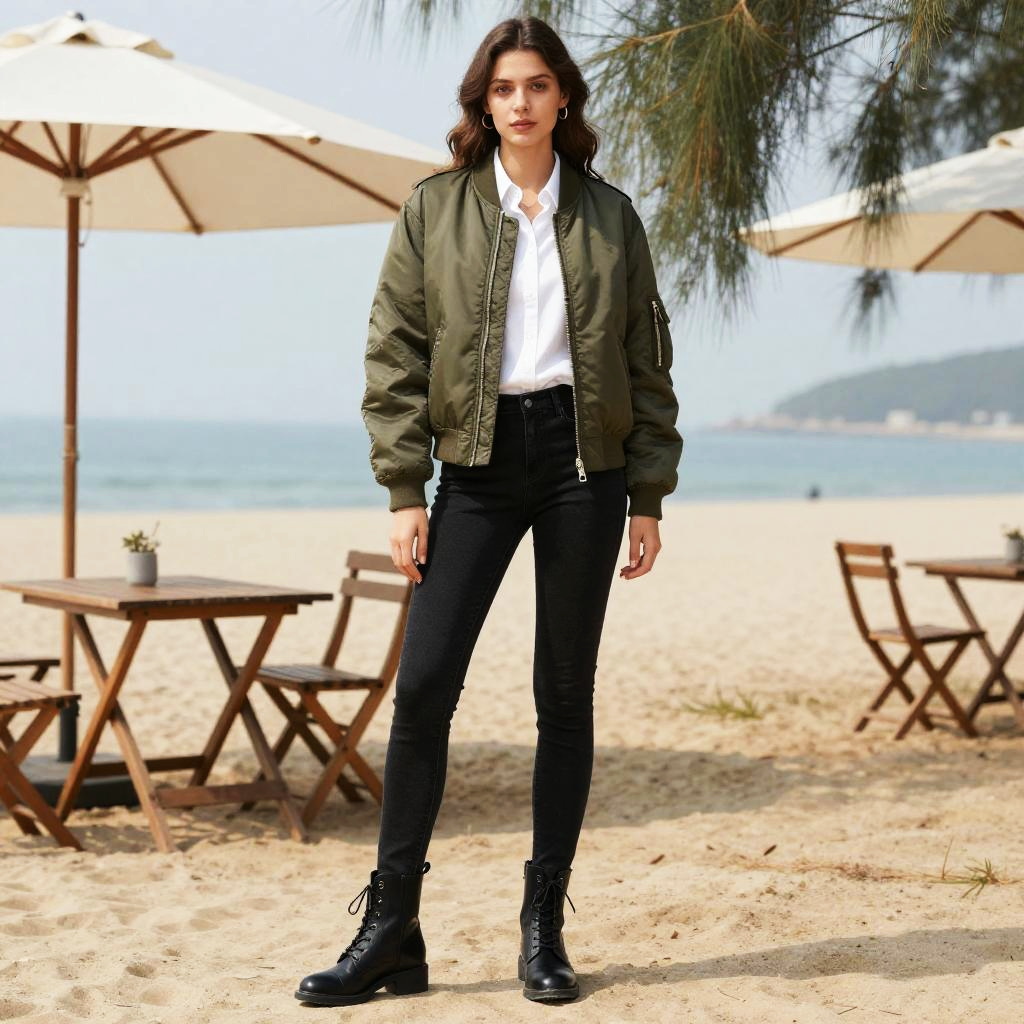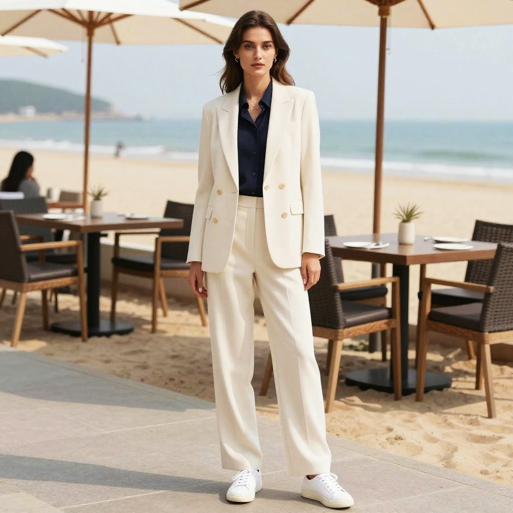 A tall woman in a contemporary minimalist sleeveless cream mini dress with a pleated skirt and black ankle boots stands on a luxury hotel private beach cabana, surrounded by soft ocean waves and palm trees. Visual style: wit studio. Sexy. Pretty face and beutiful eyes