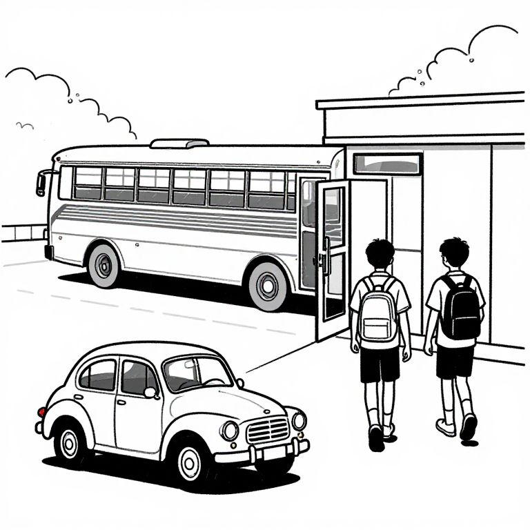 Retro Cars black and white simple sketch, behind middle school student males wearing backpacks walking out the door to the outside parking lot bus,