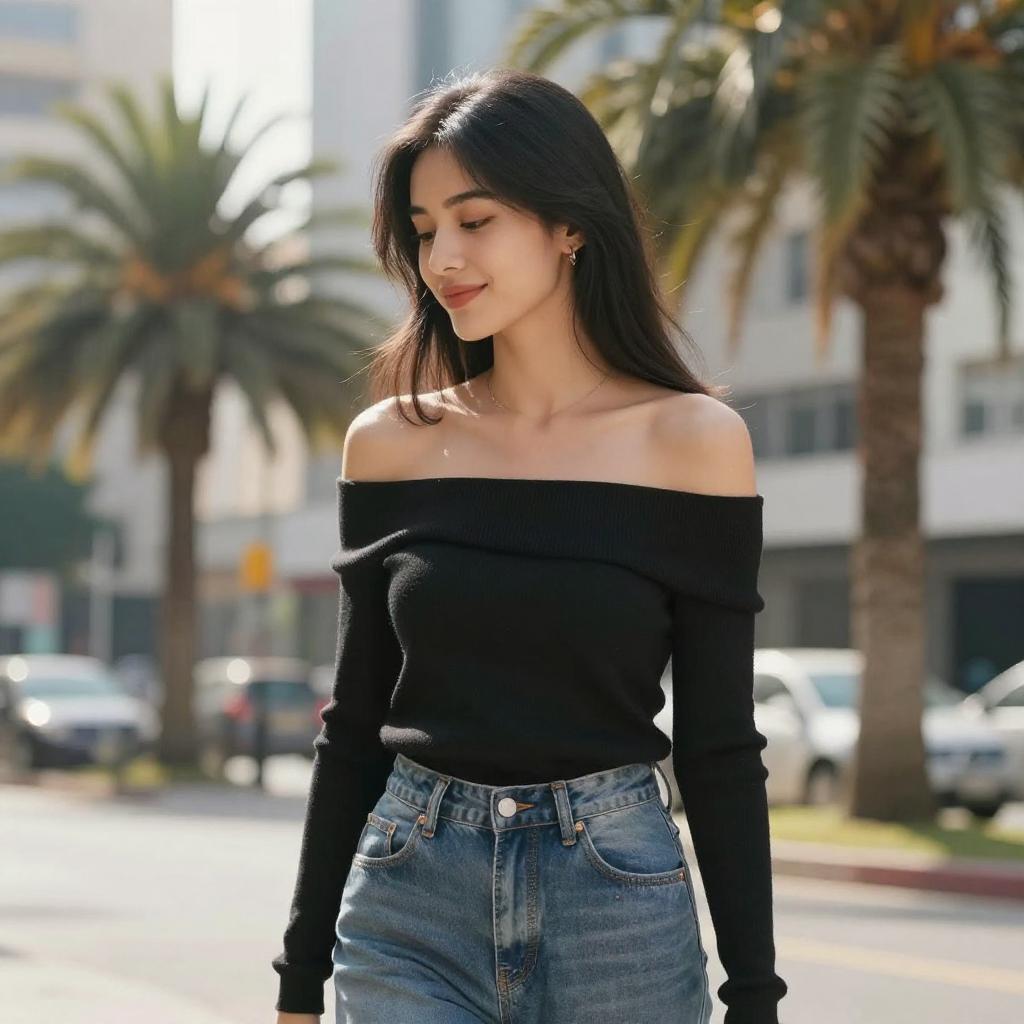 Photograph of a young woman with long brown hair, wearing a pink ribbed sweater, checkered mini skirt, and knee-high gray boots. She carries a small pink handbag and touches her hair with a smile. She stands on a sunlit urban sidewalk with blurred buildings and greenery in the background.