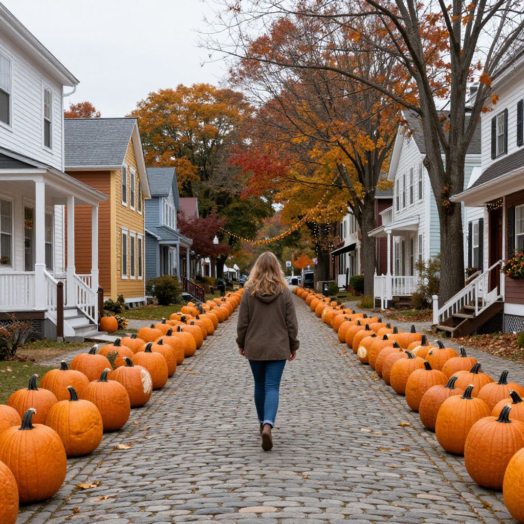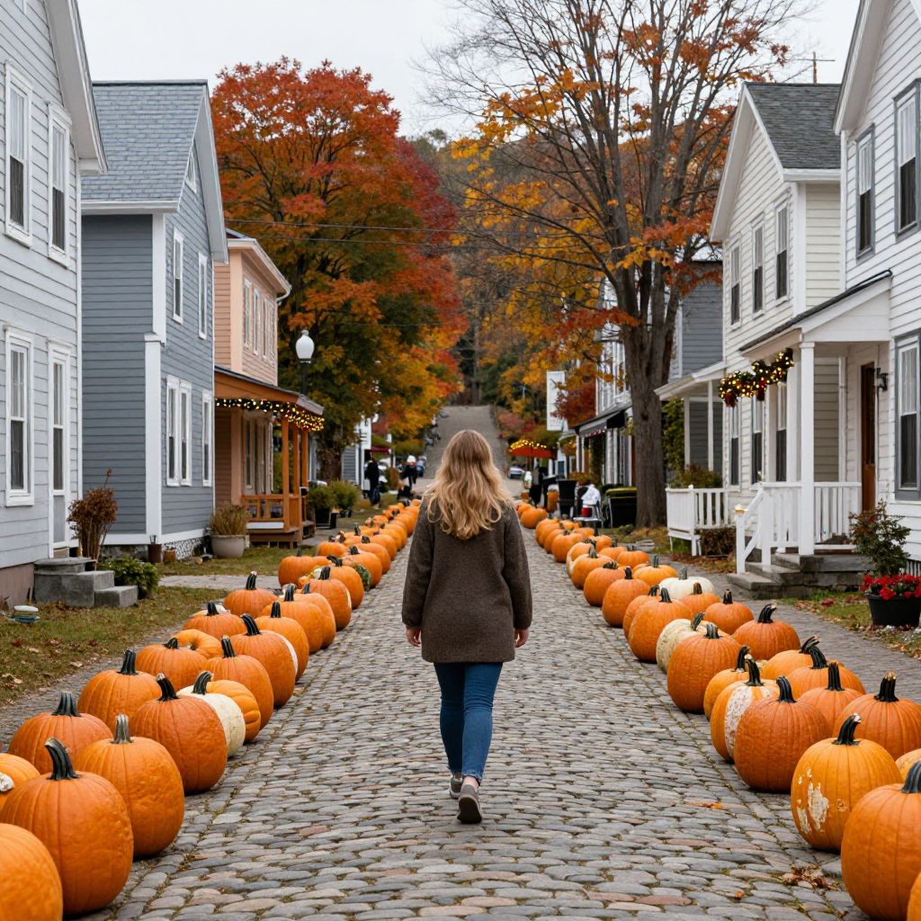 Woman strolling along a cobblestone street in Woodstock, Vermont, flanked by rows of vibrant orange pumpkins and autumnal trees, with colorful houses and festive decorations lining the path.
