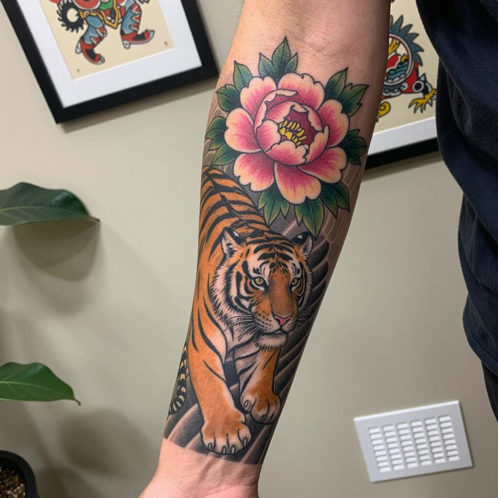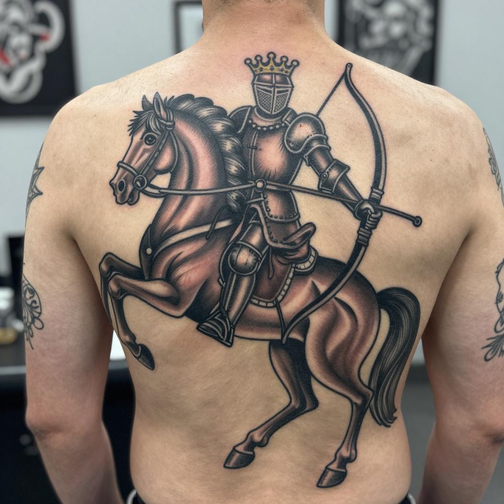 Photograph of a man with a detailed black and gray tattoo sleeve on his right arm. Tattoo includes a skull in a helmet, gears, a face with intense eyes, and a gun. Man wears a dark gray shirt and blue jeans. Background has a blurred black and white frame on a white wall. Man stands with his back slightly turned, showing upper body.
