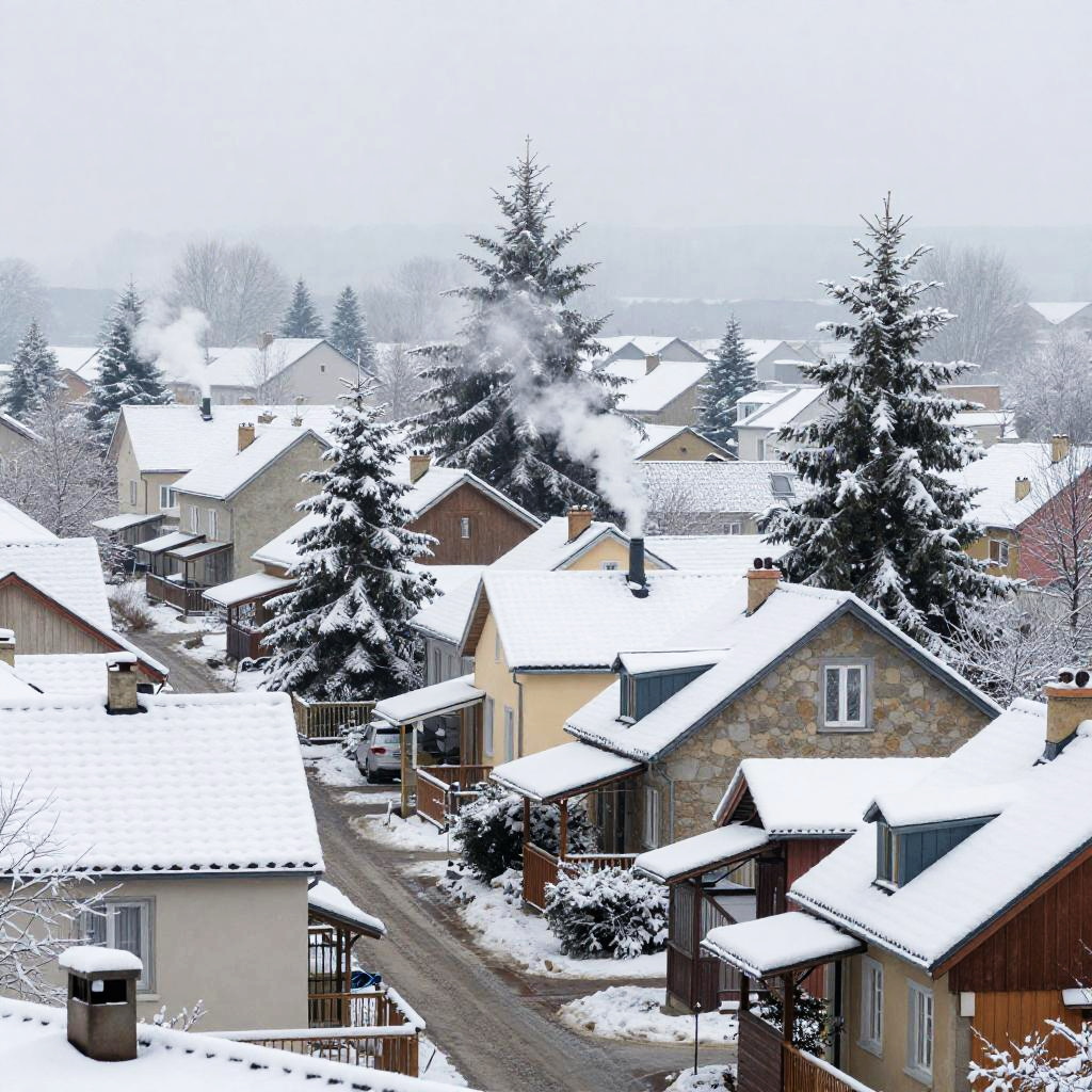 A wintery European suburb scene, snow-covered rooftops and streets, smoke curling from chimneys, evergreen trees frosted with snow, soft diffused light, evoking a cozy and magical winter atmosphere
