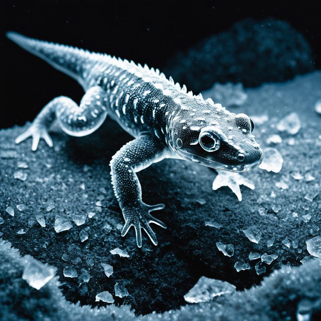 Portrait of a ice salamander made of frosted crystal with fragile ice formations, glistening surface, dramatic lighting.