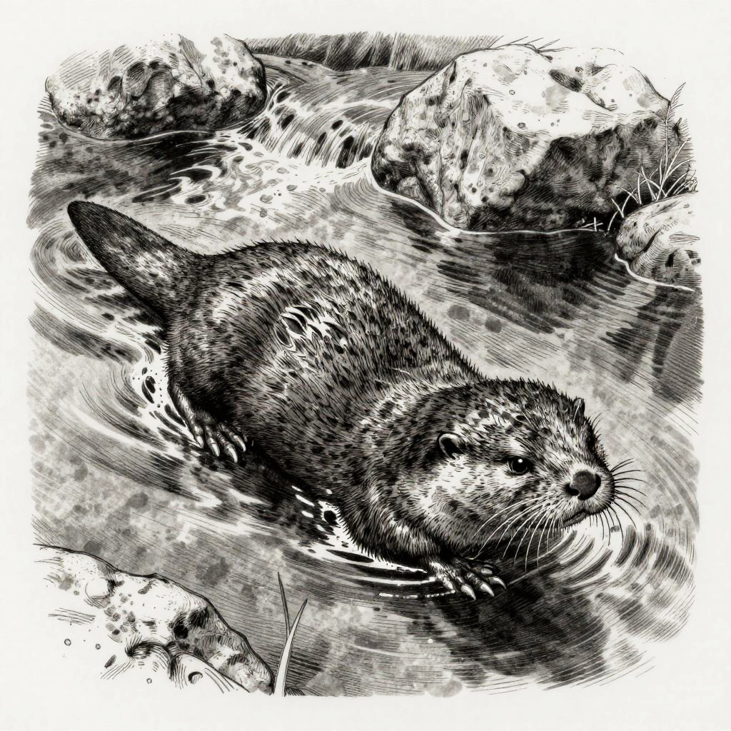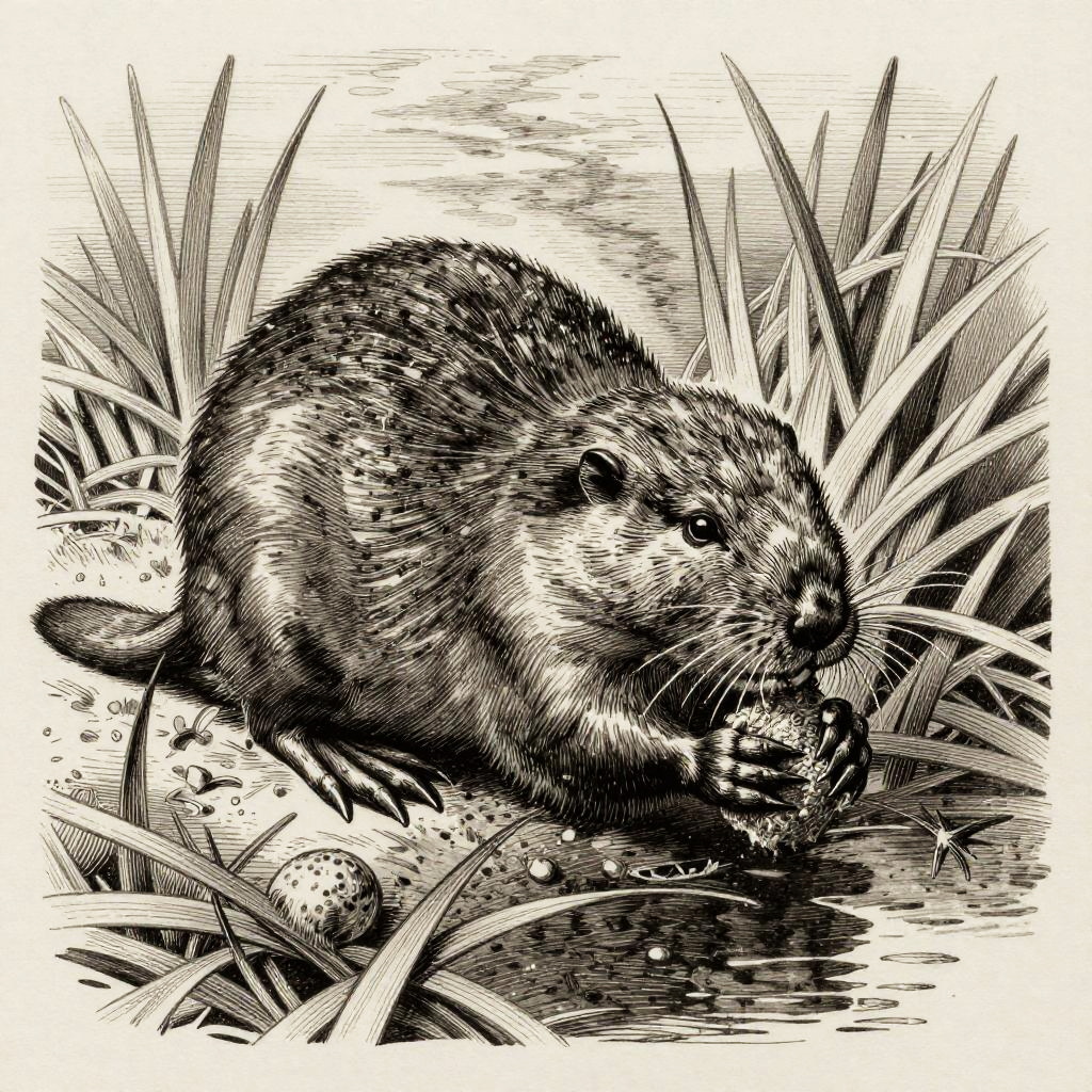 A detailed monochrome woodcut engraving depiction of a beaver gnawing, set in riverbank amidst tangled reeds, realistic fur texture, intricate hatching and crosshatching shading, black and white palette, precise natural anatomy and whisker patterns, high-contrast chiaroscuro with deep blacks and crisp highlights, balanced composition, dynamic negative space, directional strokes suggesting motion, subtle ink bleed and paper grain, museum illustration aesthetic, archival print texture, timeless graphic character