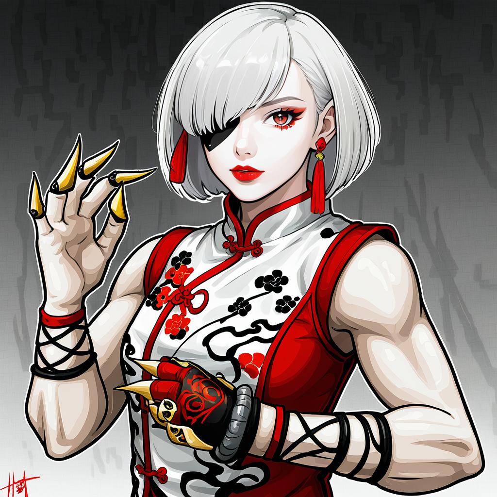A.k.i. (street fighter), street fighter, 1girl, pale skin, red lips, mole under mouth, red eyes, hair over one eye, short hair, white hair, grey hair, china dress, chinese clothes, tassel earrings, claw (weapon), claw ring, by artist chm (macharge), anime