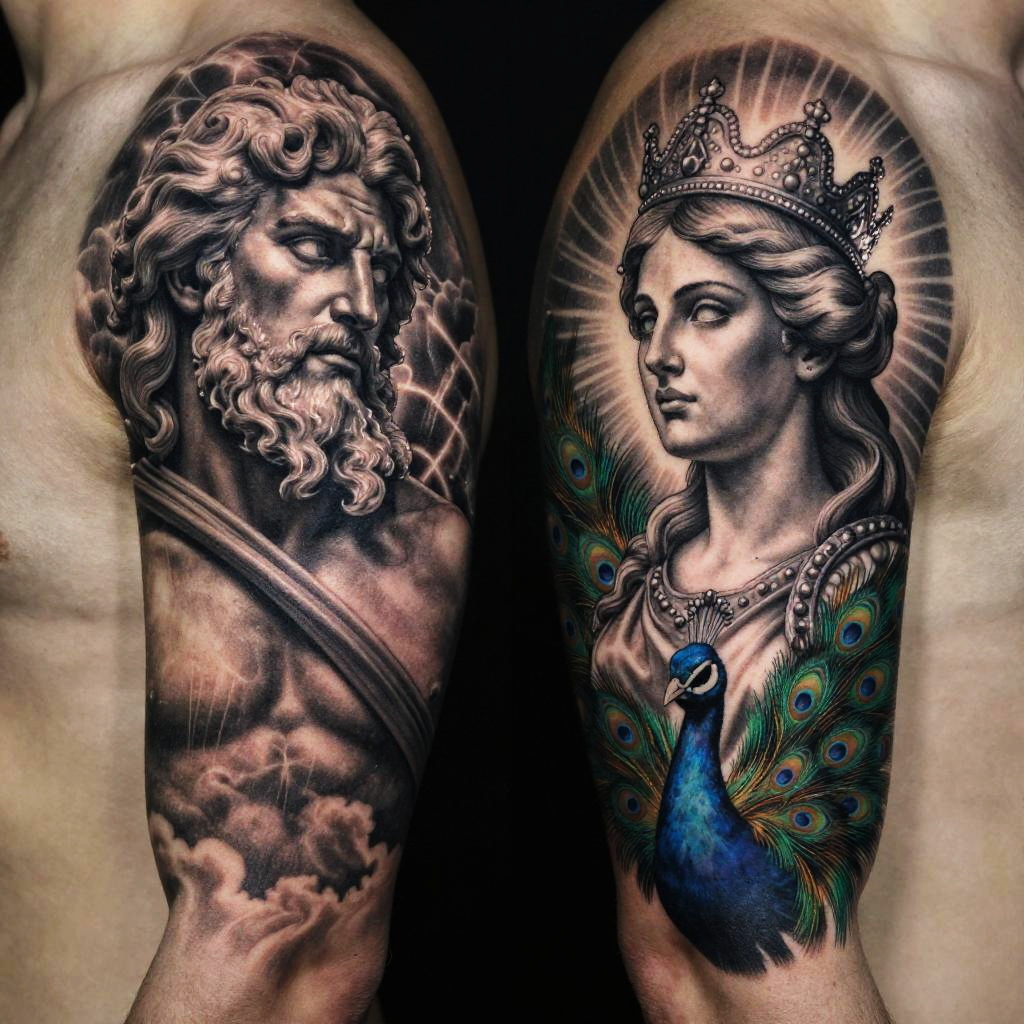 Zeus and Hera tattoo, blend of mythological symbolism and realism, Zeus with stormy clouds, Hera with royal crown and peacock, elaborate line work, dynamic composition, intense expressions
