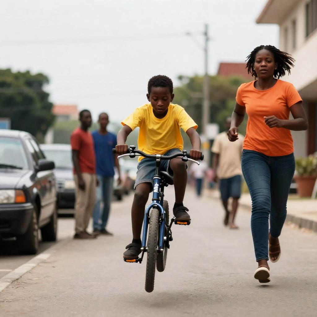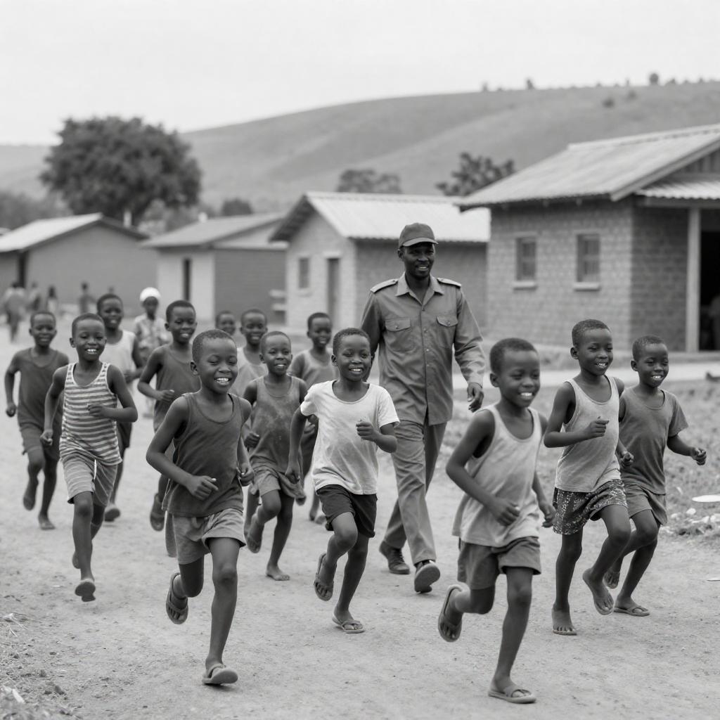 Black-and-white photograph of a group of African children running in a rural village. A man in a hat and uniform walks among them. Brick houses and hills in the background. Children wear casual clothes, smiling. About 20 children, 1 adult.
