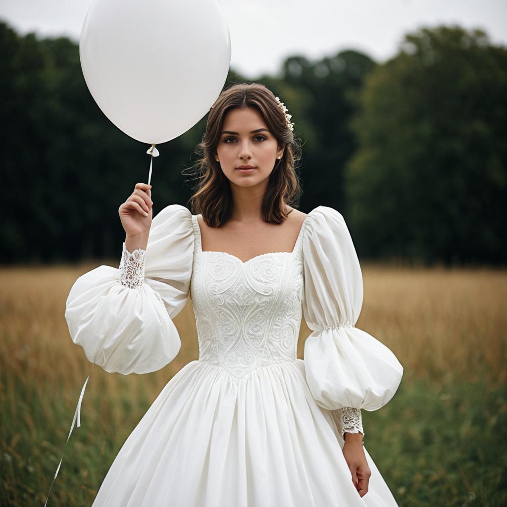 Balloon sleeve wedding dress,1girl, solo, dress, balloon, blurry background, white dress, realistic, brown hair, blurry, looking at viewer, photorealistic, outdoors, skirt hold, brown eyes, puffy sleeves