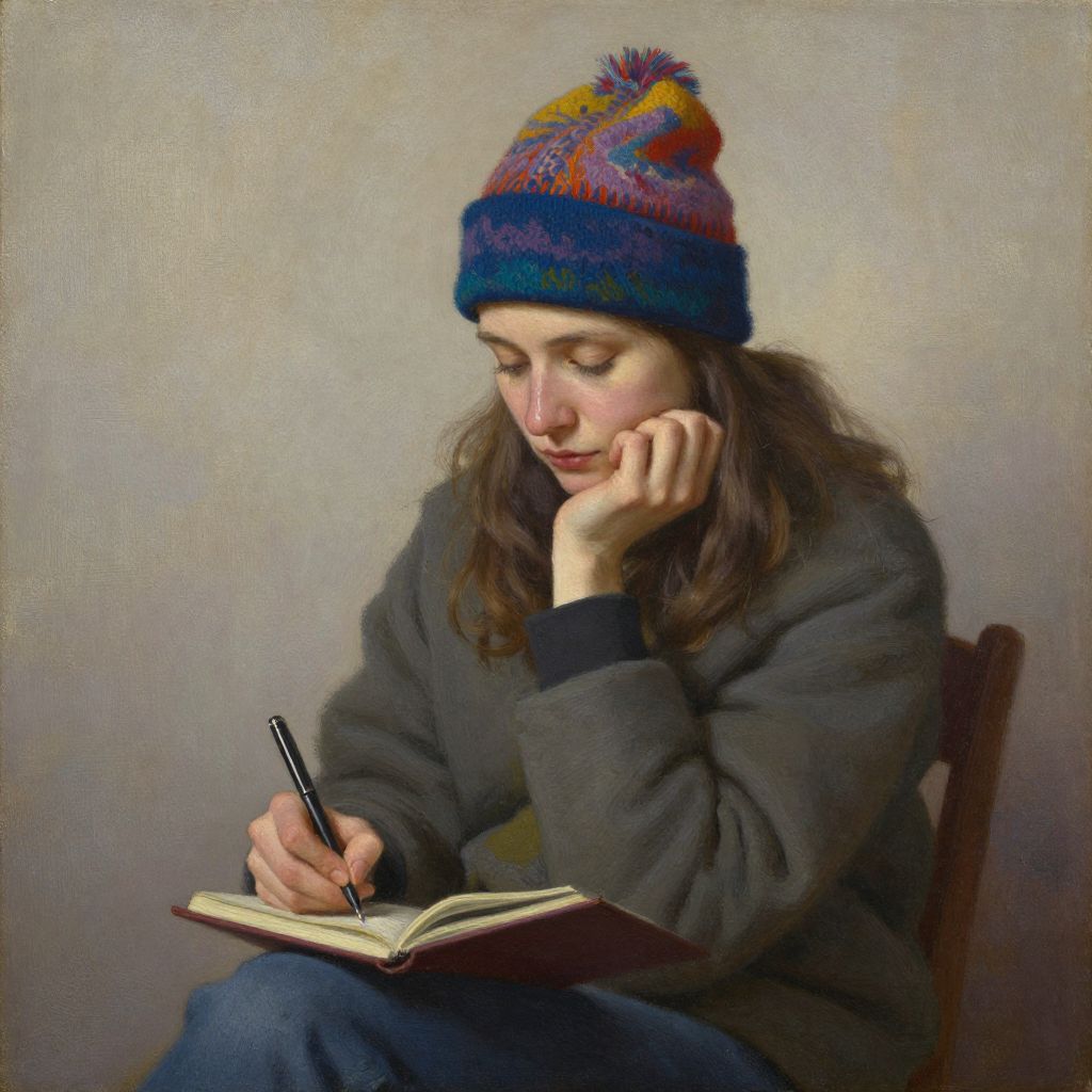 A detailed oil painting of a woman wearing a colorful beanie, sitting and writing in a journal, with a thoughtful expression, by Julia Razumova, 2021 award-winning artwork.