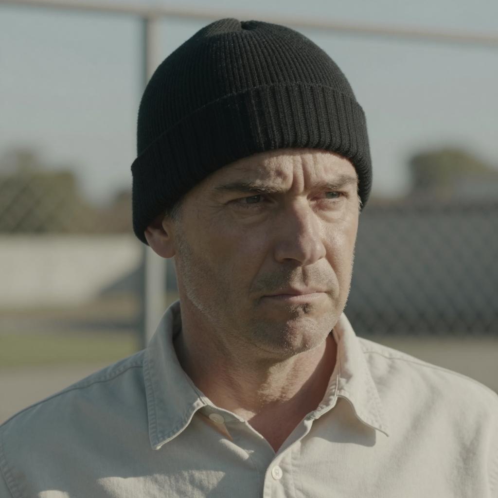 Middle-aged man with light skin, wearing beige cap and blue denim vest over gray shirt, reclining on yellow and white striped lounge chair. He has short brown hair, slight wrinkles, and a relaxed expression. Background is blurred green grass and leaves. Man is centered, facing slightly to the right.