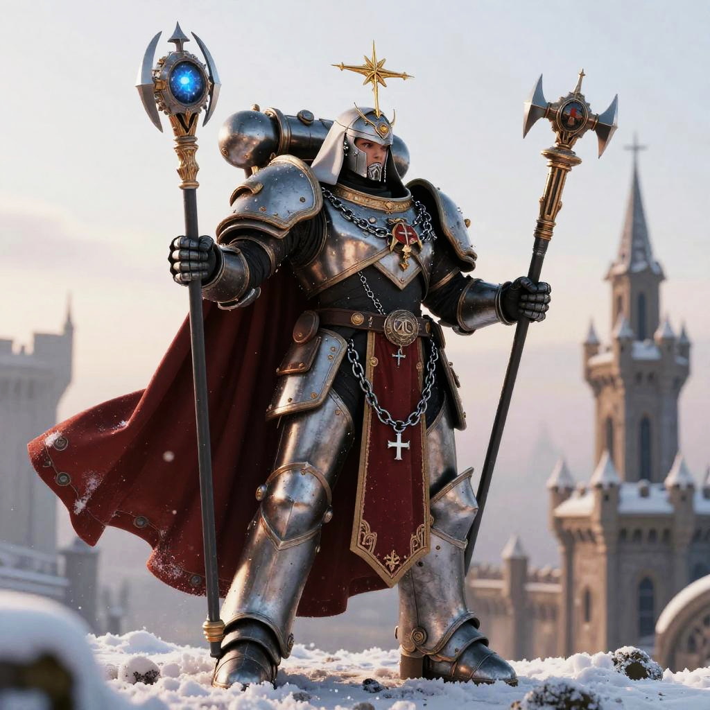 Heroic image of a Sister of Battle (Adepta Sororitas), wearing ceremonial gothic power armor with a flowing crimson tabard and chained rosaries, holding relic-encrusted storm bolter, amidst a snow-covered citadel spire at dawn.