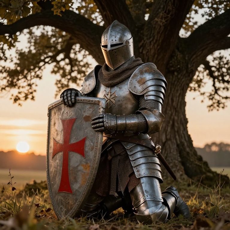 Photograph of a medieval knight in silver armor, kneeling under a large tree at sunset, holding a shield with a red cross.