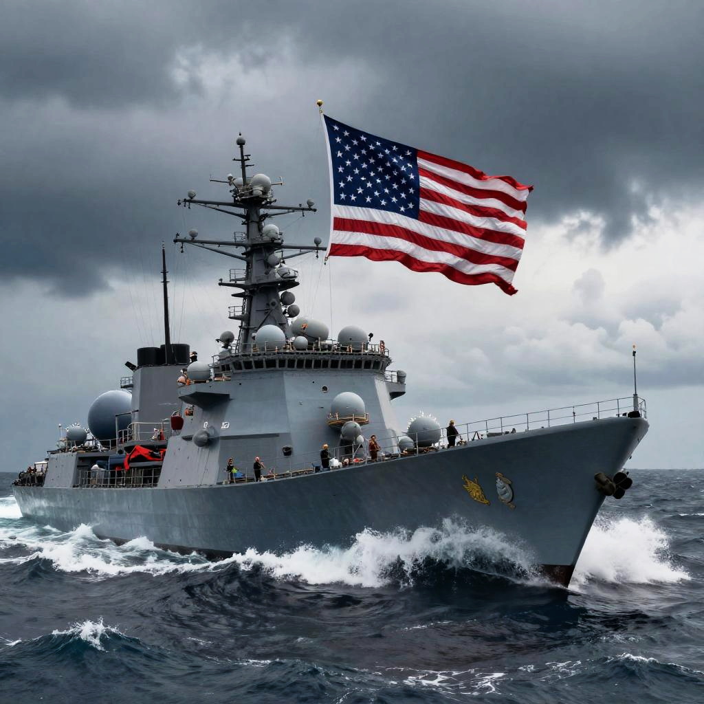 US empire flag flying on a massive naval ship cutting through stormy ocean waves, mixing traditional American flag elements with imperial insignias, dynamic motion, stormy sky, realistic and atmospheric rendering.