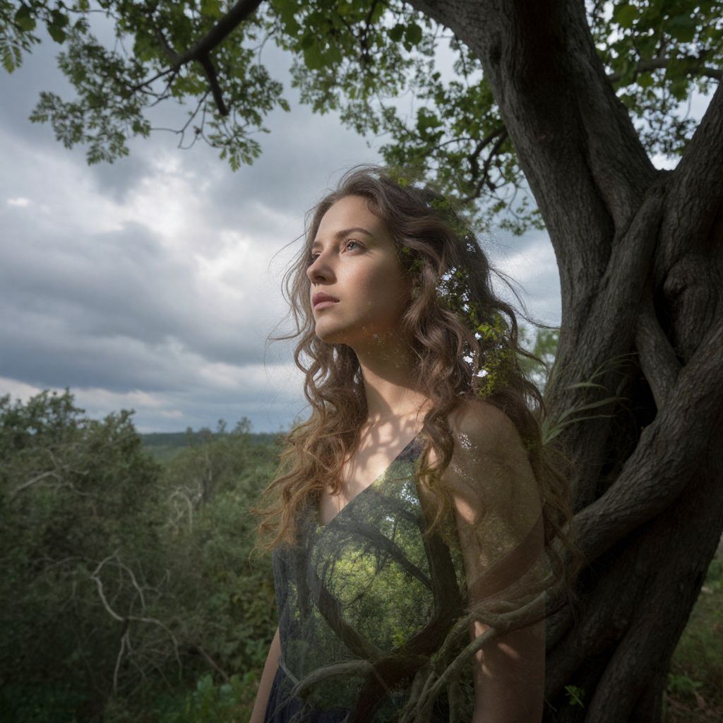 A captivating double exposure portrait showcases a mesmerizing woman with flowing hair that seamlessly blends with an ancient tree's tendrils. Her serene face, partially hidden by leafy foliage, gazes into the distance beneath swirling clouds in an overcast sky. The secondary image reveals a dense forest canopy where sunlight filters through branches, casting dappled shadows on her skin and creating an enchanting interplay of light and texture. This mystical fusion of nature and humanity captivates viewers with its elusive yet inviting expression.