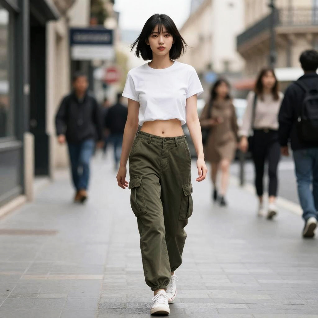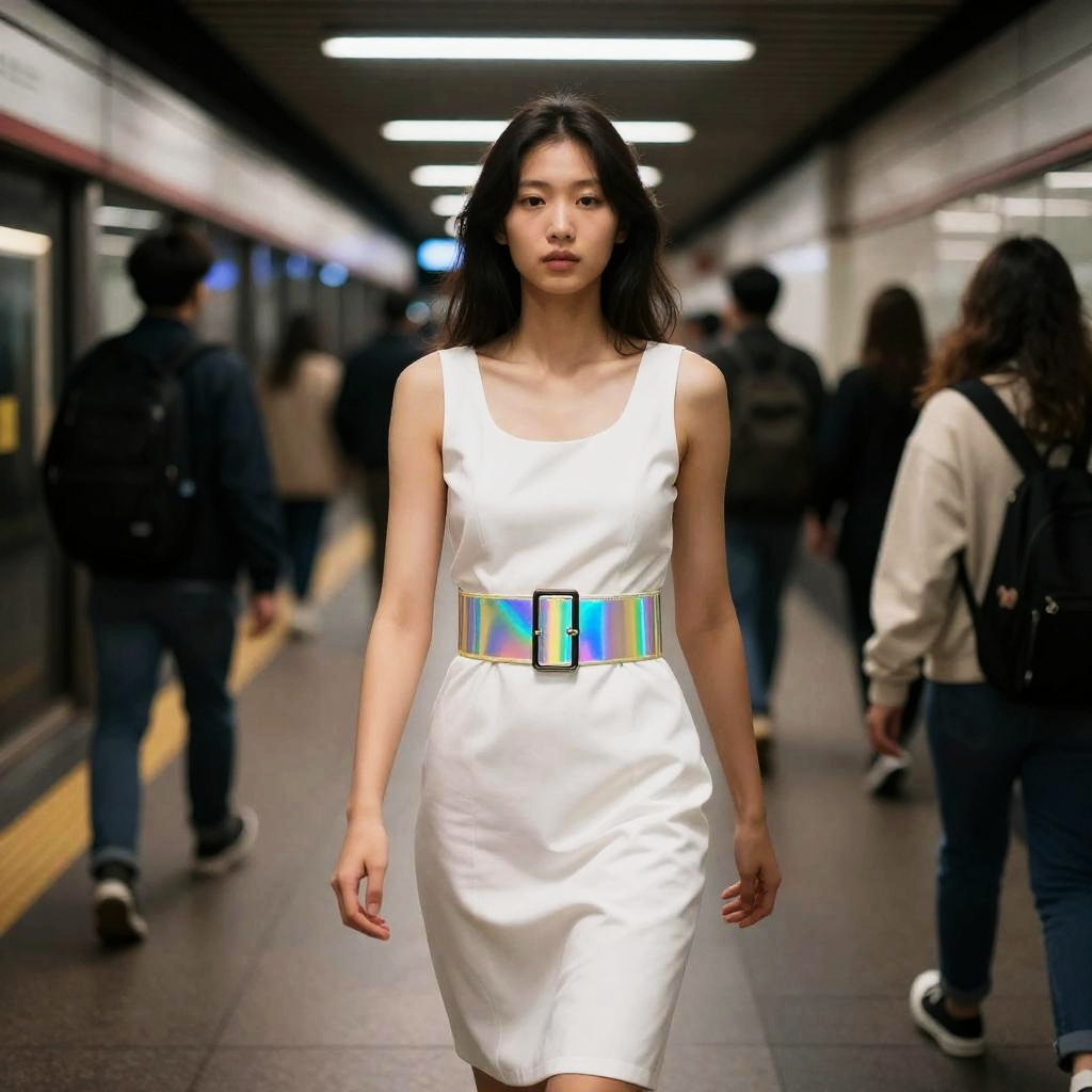 Surreal performance artist in a wide iridescent holographic belt, cinching her dress in a neon-lit underground subway station during rush hour
