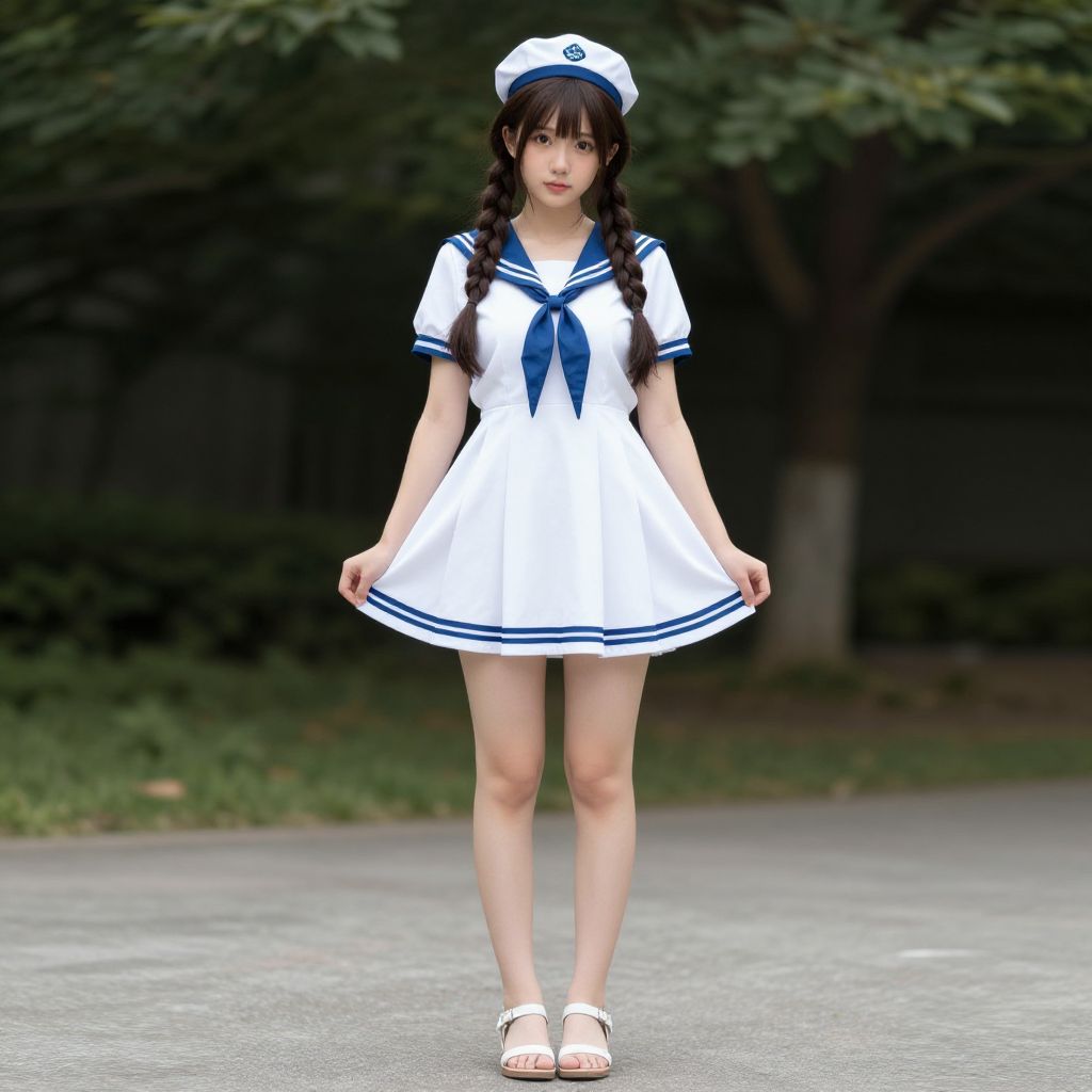 Photograph of an East Asian woman with long black hair in twin braids, wearing a white sailor-style dress with navy blue trim and a matching navy blue neckerchief, white sailor hat, and white sandals. She stands on a paved path with a green, tree-filled background. The dress flares out slightly, and she holds the sides gently. Her expression is neutral, and she has fair skin. The image has a realistic, slightly soft-focus style, emphasizing her cute and youthful appearance.